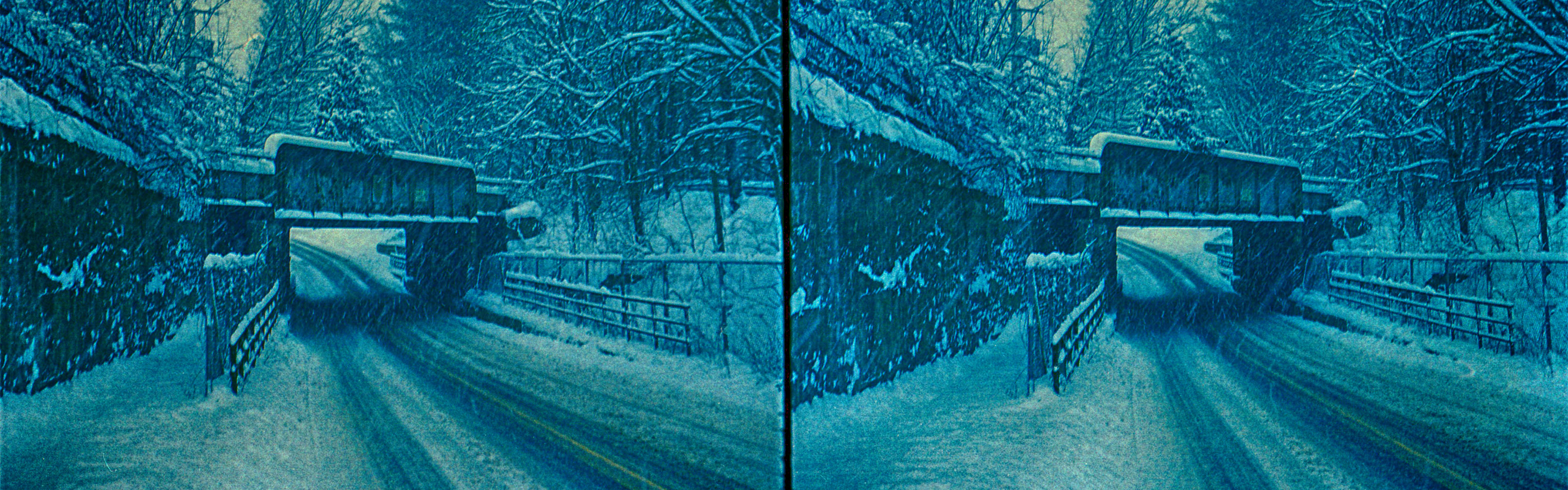 Winter on New Scotland Road. Kodak Realist stereo camera, Kodak Gold 400 film, tinted in monochrome. Photo (c) Chuck Miller, all rights reserved.