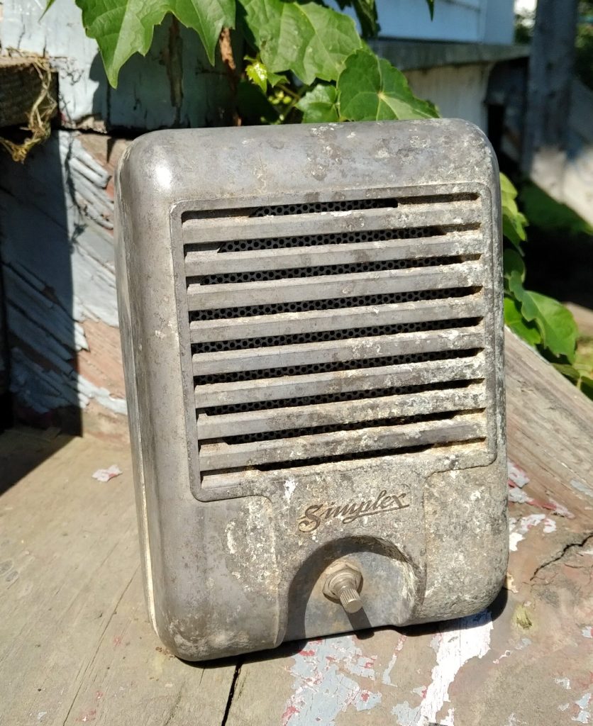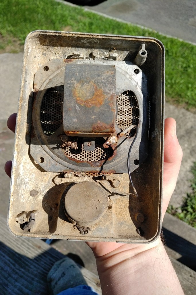 This is a vintage Simplex speaker. In addition to drive-in speakers, Simplex also makes fire alarms and motion detectors. As for this unit … the eBay seller told me it was “just like new, vintage.” Yeah, I can spot a bullshit artist from a mile away, but the unit was cheap and the exterior wasn’t that bad.