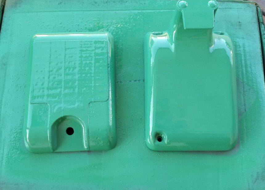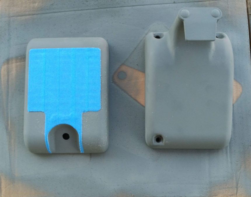 I want the front of the unit to have a two-tone appearance. So after I sprayed the chassis with the self-etching primer, and after the primer had finally dried, I masked off the front part of the grille.
