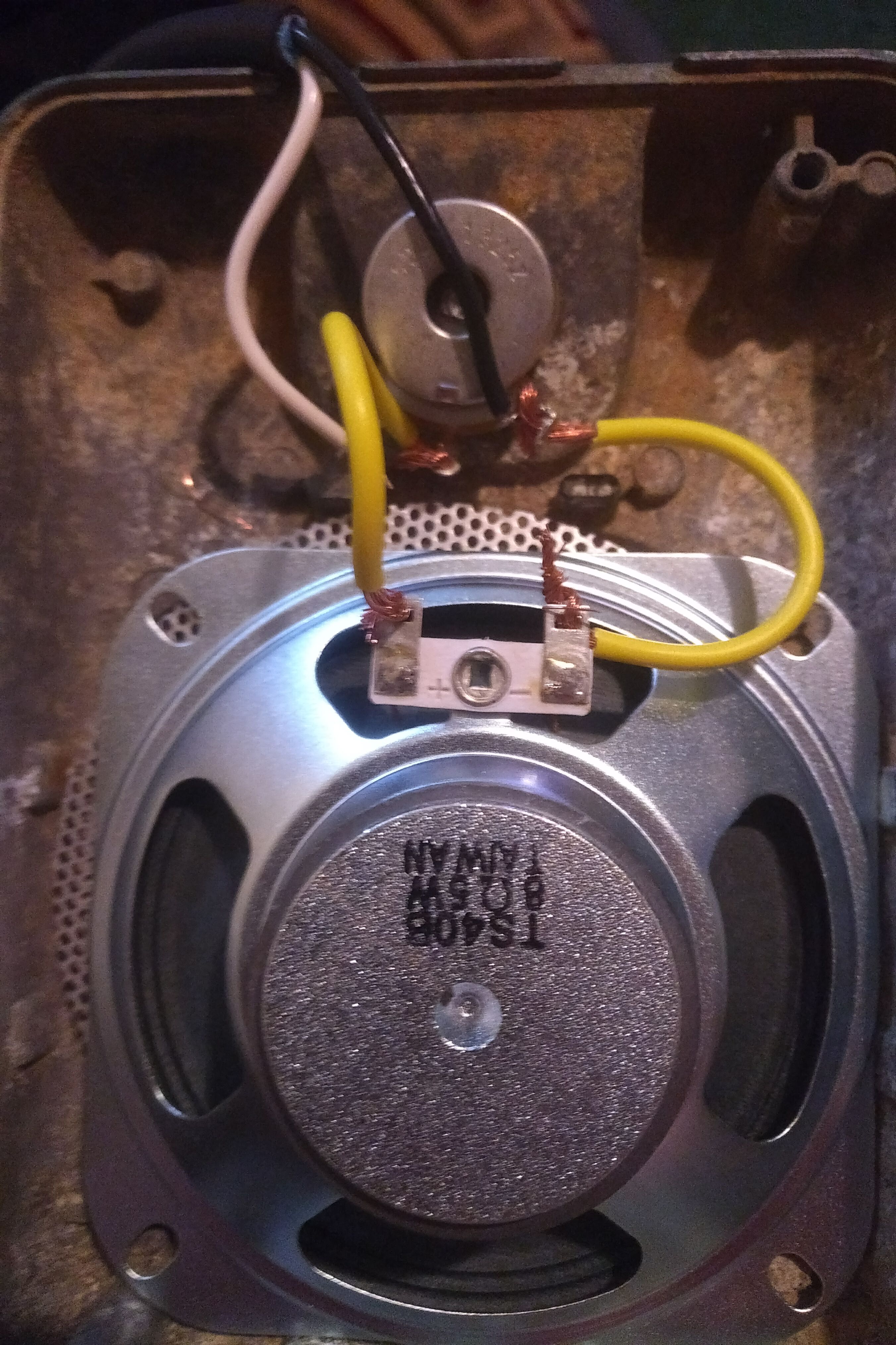 I ordered an entire replacement set from Detroit Diecast – a new 4×4″ speaker, new external “curly” wires, a new potentiometer and a new control knob.