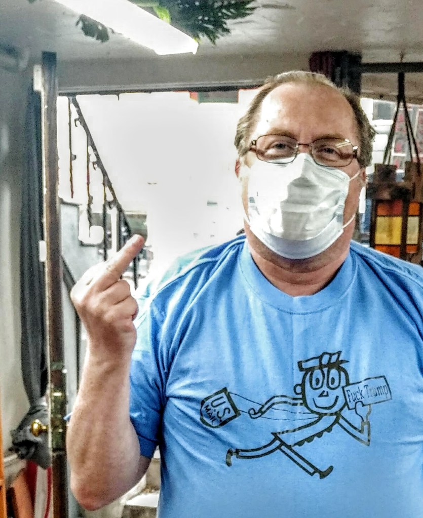 We now get to current days. My FB friend Ken Screven (the legendary WRGB broadcaster) posted a photo of his neighborhood’s letter carrier – a carrier who was wearing a distinctive custom-made T-shirt.