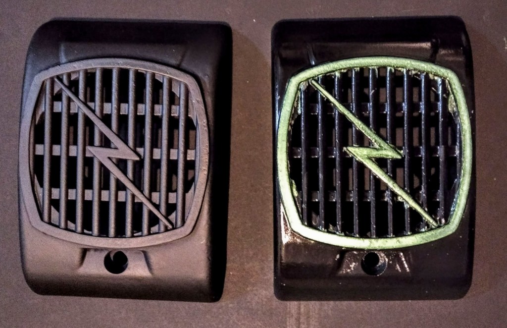 Using masking tape and painter’s tape, I masked off the front grill faces. Then, I used a razor blade to delicately trim through the lightning bolt and the outer border. These will be painted, while the remainder of the unit will remain black.