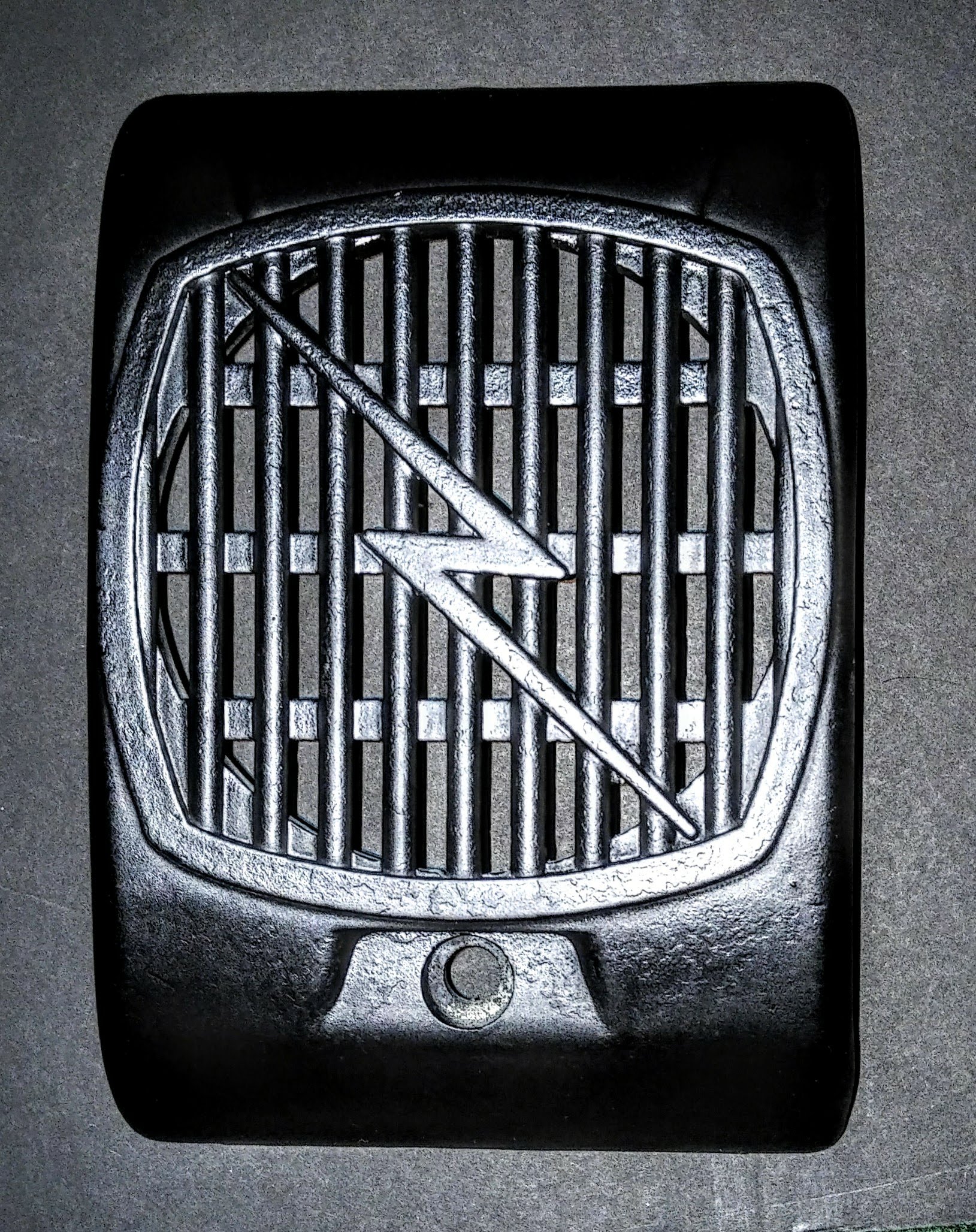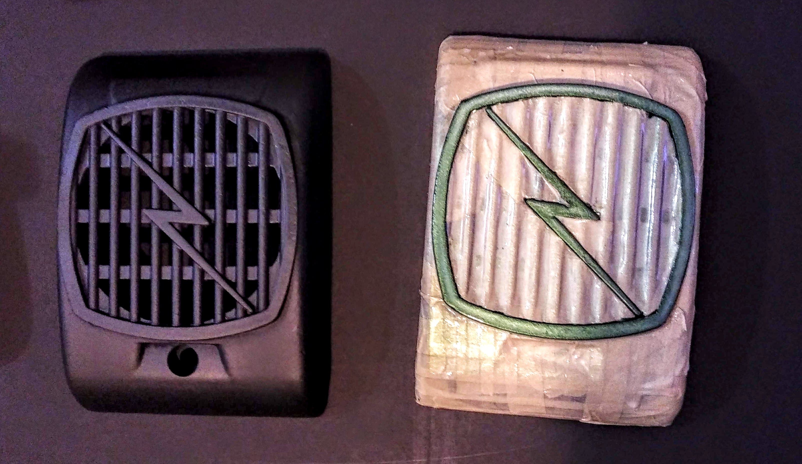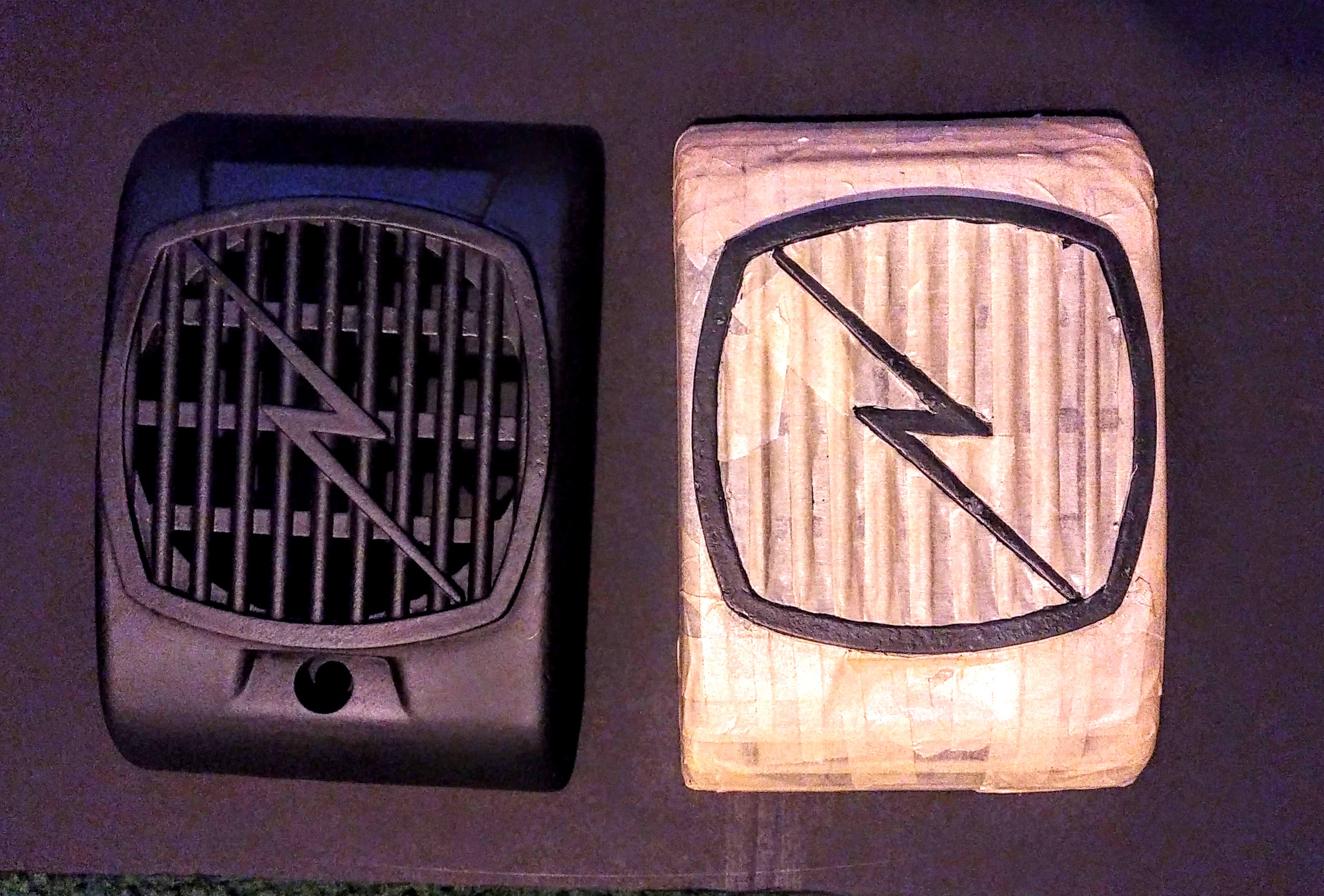 Using masking tape and painter’s tape, I masked off the front grill faces. Then, I used a razor blade to delicately trim through the lightning bolt and the outer border. These will be painted, while the remainder of the unit will remain black.