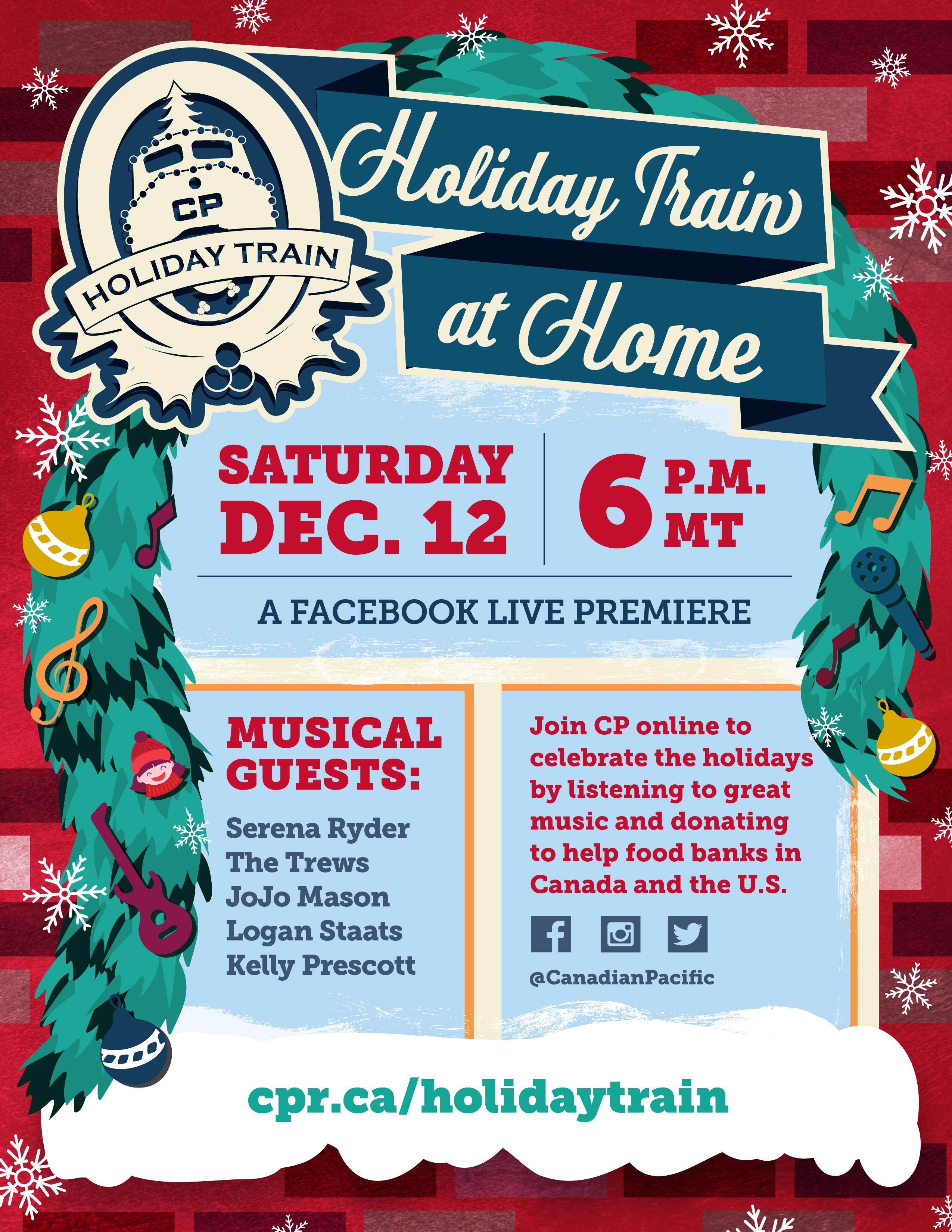 The Dec. 12 concert, scheduled for 6 p.m. MT / 8 p.m. ET, will also feature performances by JoJo Mason, Logan Staats and Kelly Prescott. CP Holiday Train fans will be able to view the concert by visiting facebook.com/canadian.pacific at the show’s start time. An archived version of the show will remain on the page for later viewing.