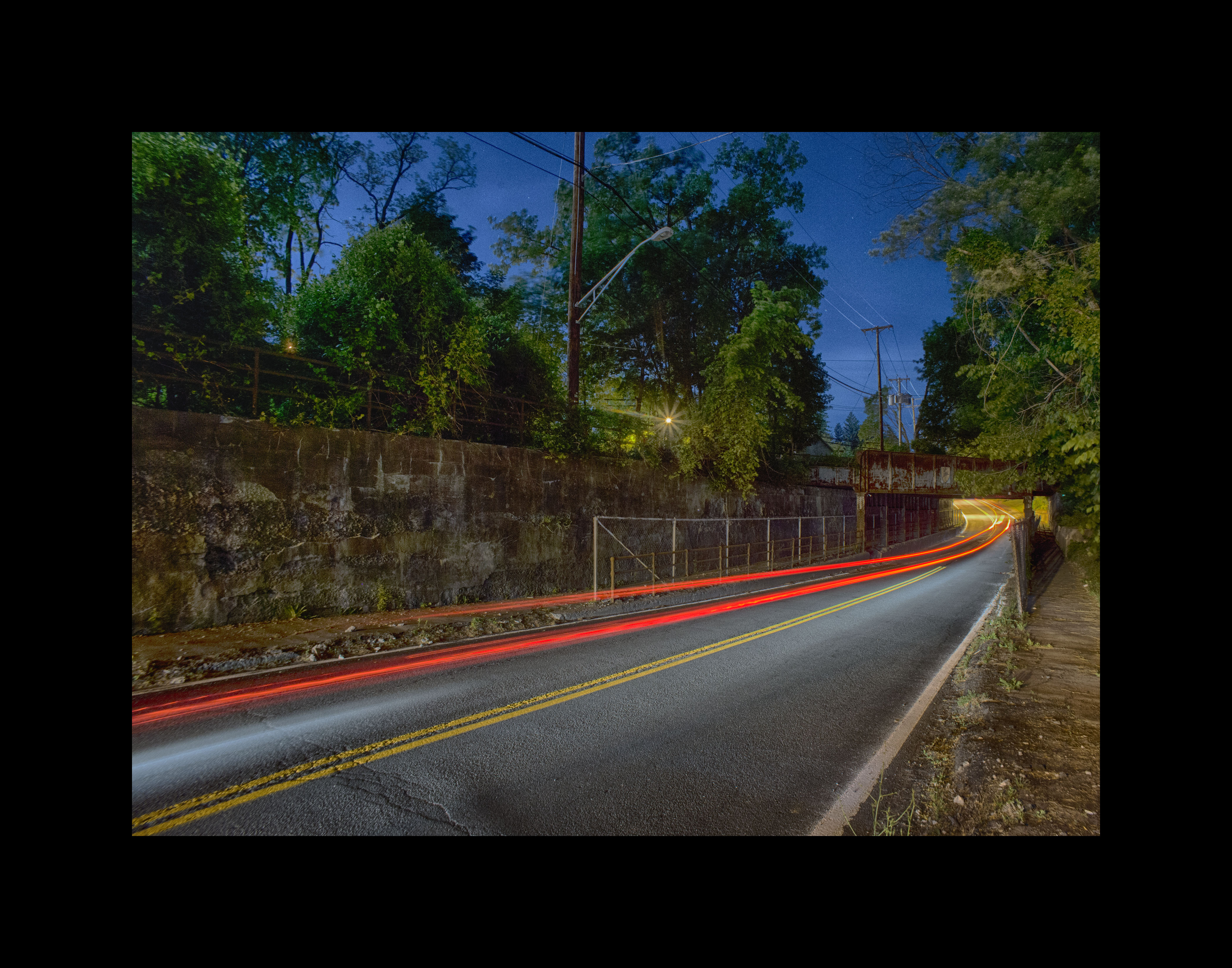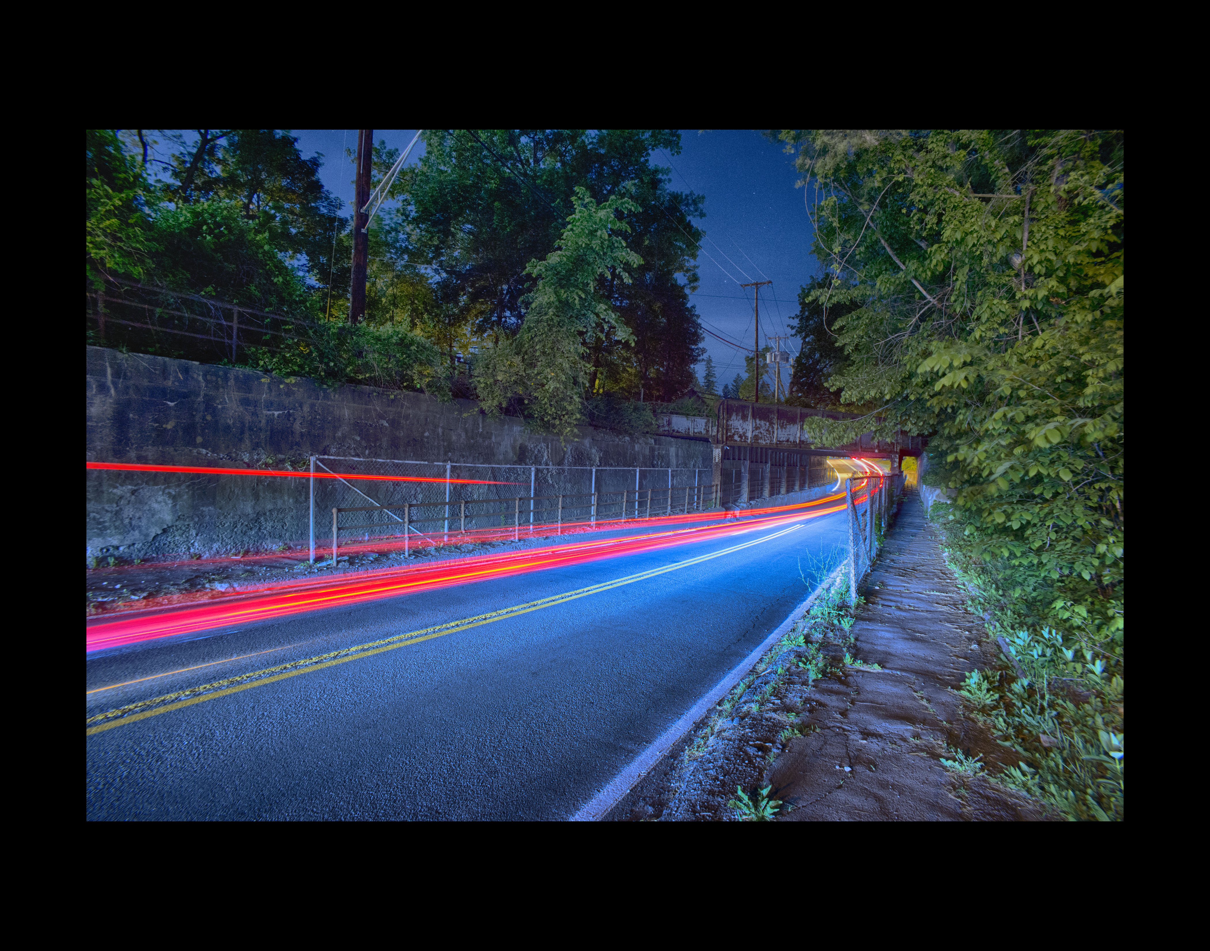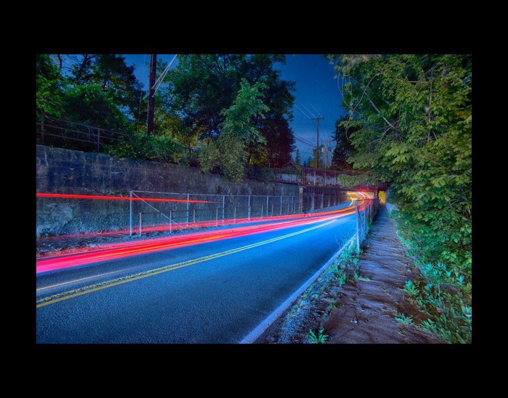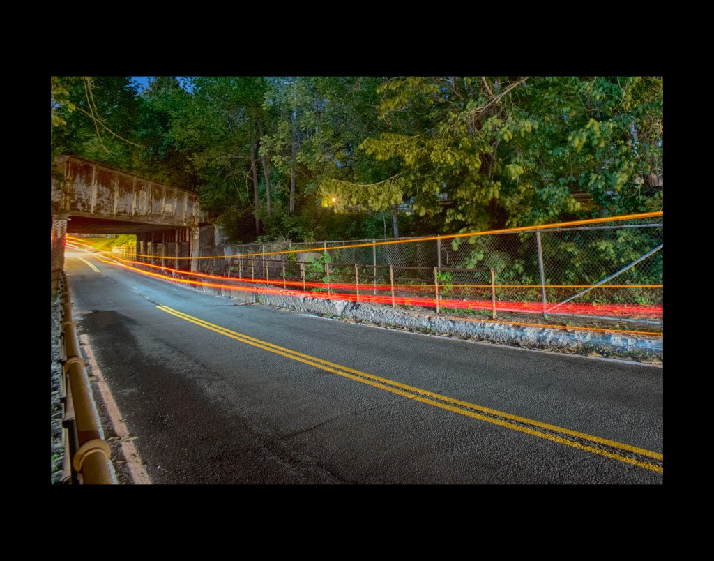 Nikon Df at the ready. I put the camera on a tripod, and used a shutter cable for long exposures. Sometimes a car would drive by, and I would get that streak of rear tail light as the car drove under the span.