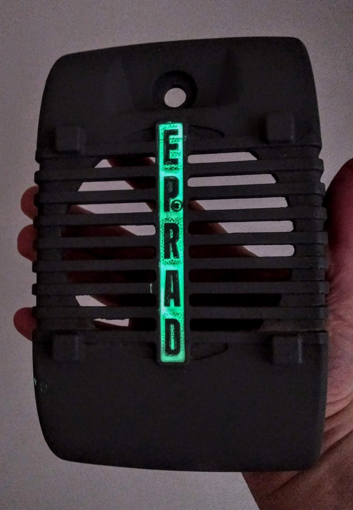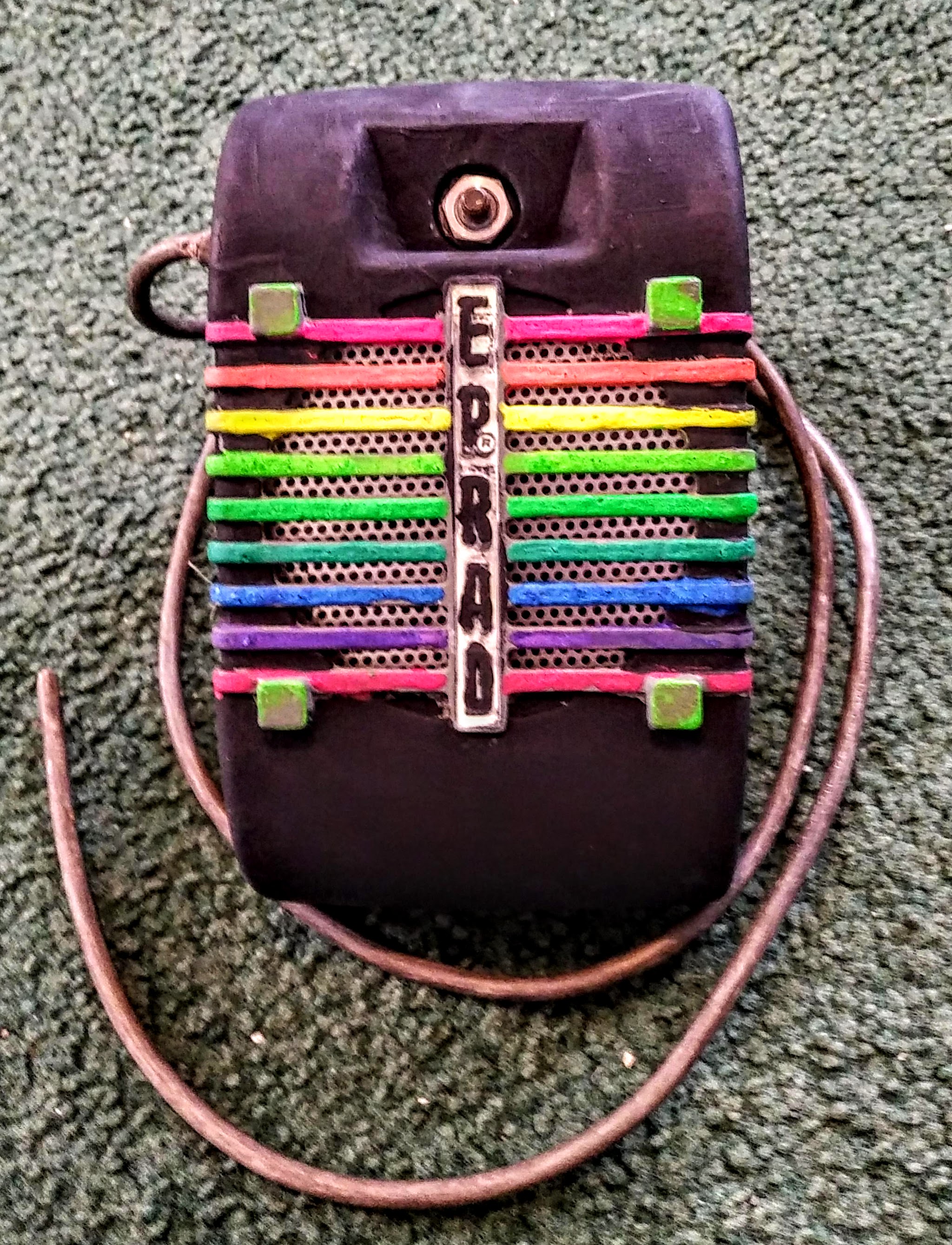 So what we have here is an EPRAD drive-in speaker. EPRAD was based in Toledo, Ohio, and they, like RCA and Projected Sound and so many other companies, manufactured distinctive drive-in theater speakers. This unit’s design shows EPRAD, in big capital letters, down the vertical front. The speaker also has the volume knob at the top of the unit, rather than at the bottom, where most drive-in speaker volume knobs are kept.