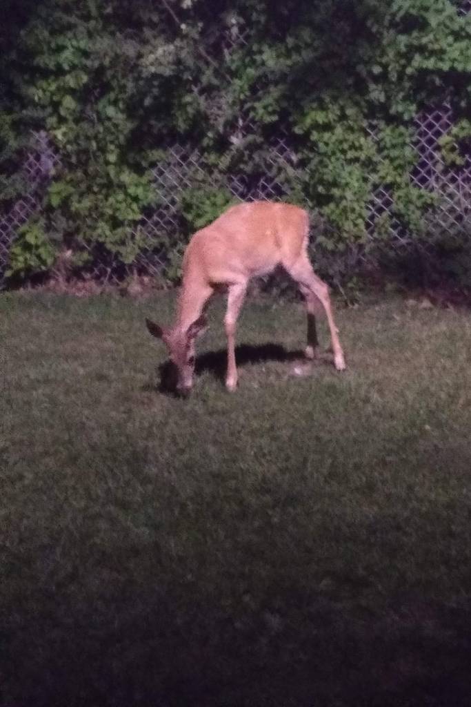 No, seriously, a young deer was munching on some evening grass.