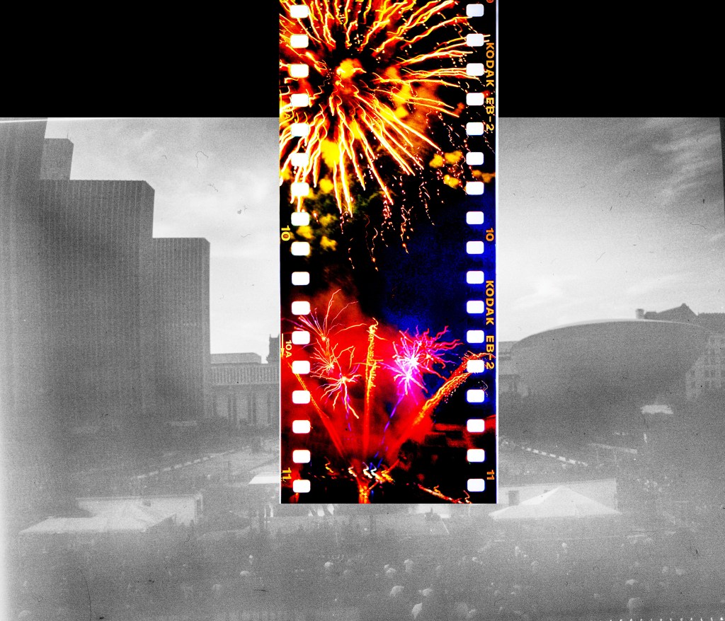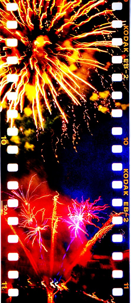 And here’s the thing. I shot three rolls of film with that big beast. I shot pre-fireworks blasts by using a roll of AGFA Scala 200, which is rare E-6 black and white slide film. Then, I shot two rolls of fireworks blooms by using pre-packed rolls of Japanese-branded Kodak Dynachrome E-6 slide film.