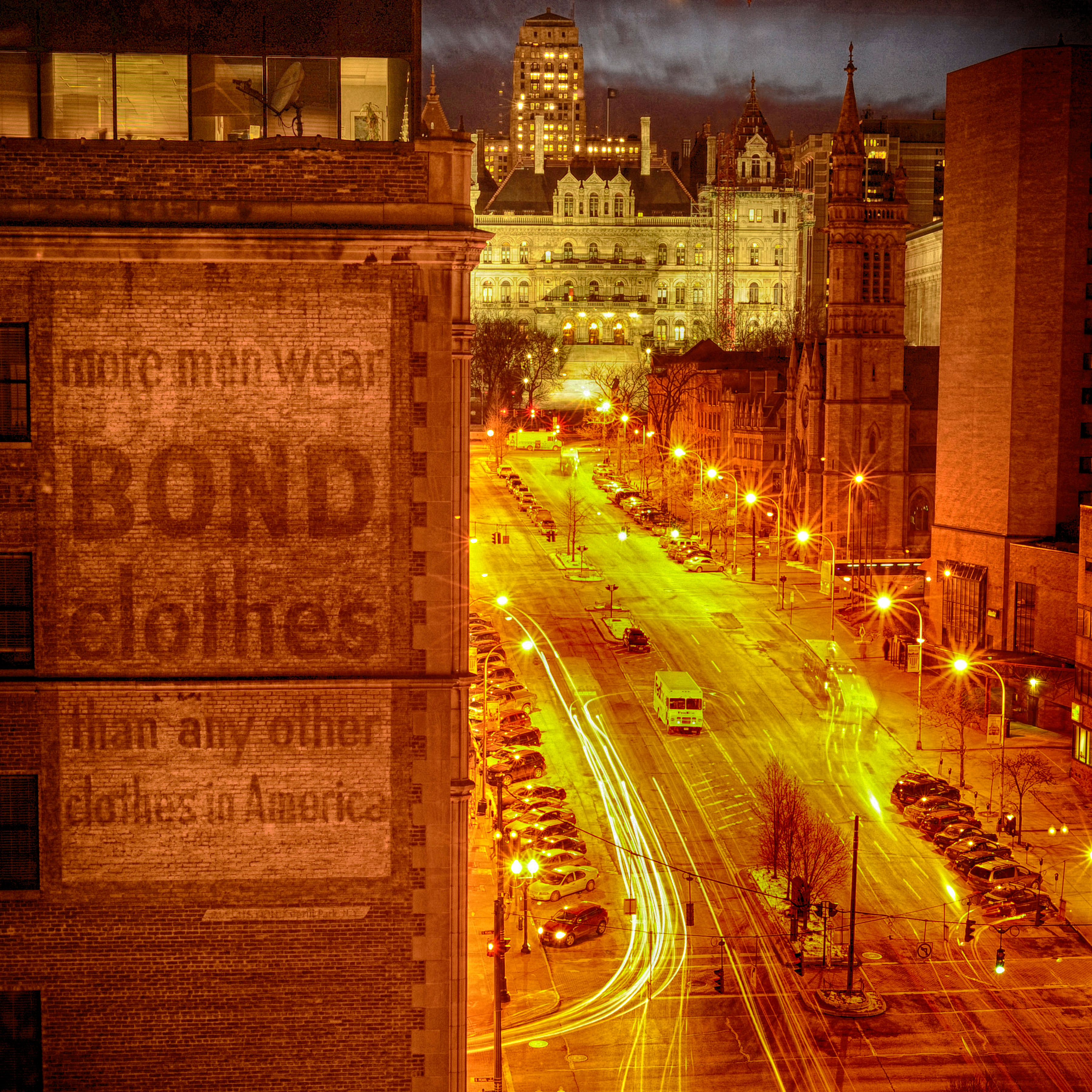 Yeah, but there was a technical issue with the print, and a replacement print wouldn’t have arrived in time for BUILT. So I went in a different direction, and pulled out this gem from 2010. Yeah, It’s an 11-year-old shot of a 30-minute exposure along State Street, with the old Bond Clothes ghost sign in the foreground.