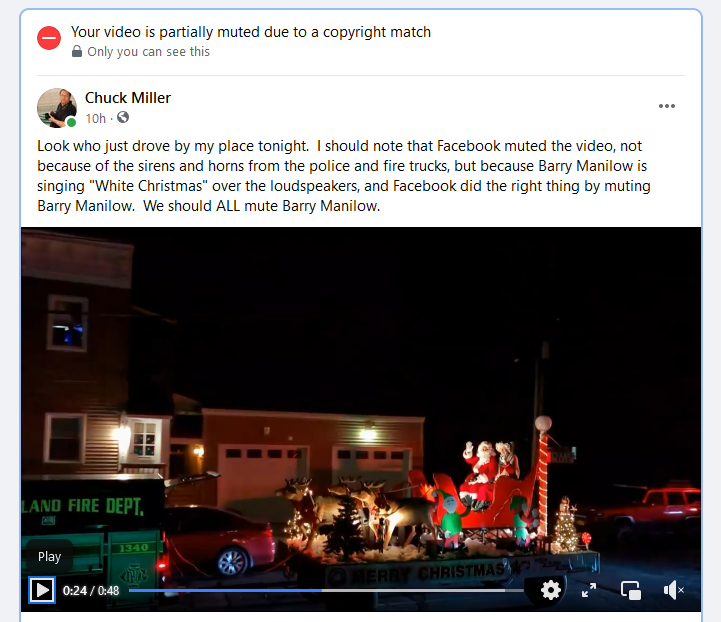 Yep. Facebook blocked the audio on my video because the parade loudspeakers were blaring Barry Manilow’s “White Christmas” loud enough for Facebook’s algorithms to automatically block it. And if there was ever a version that sounded more vanilla than Bing Crosby’s classic, well, there it is.