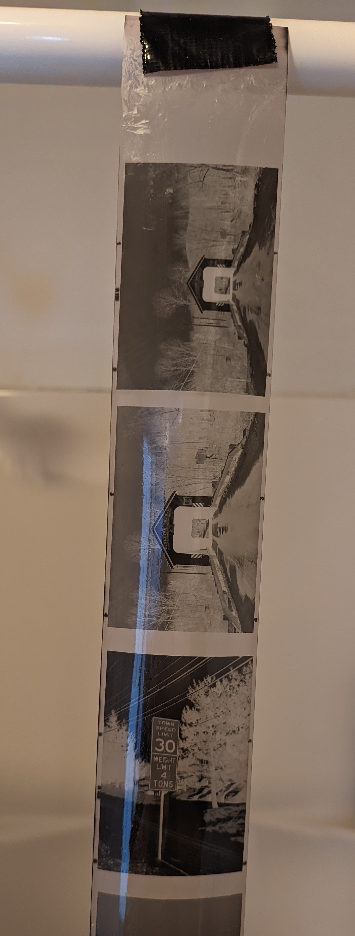 Now to let it hang and dry for a few hours. Yeah, I had to MacGyver a hanging system – duct tape to hold the film on my shower rod, and a binder clip and a ball-point pen at the other end to hold the film straight while drying.