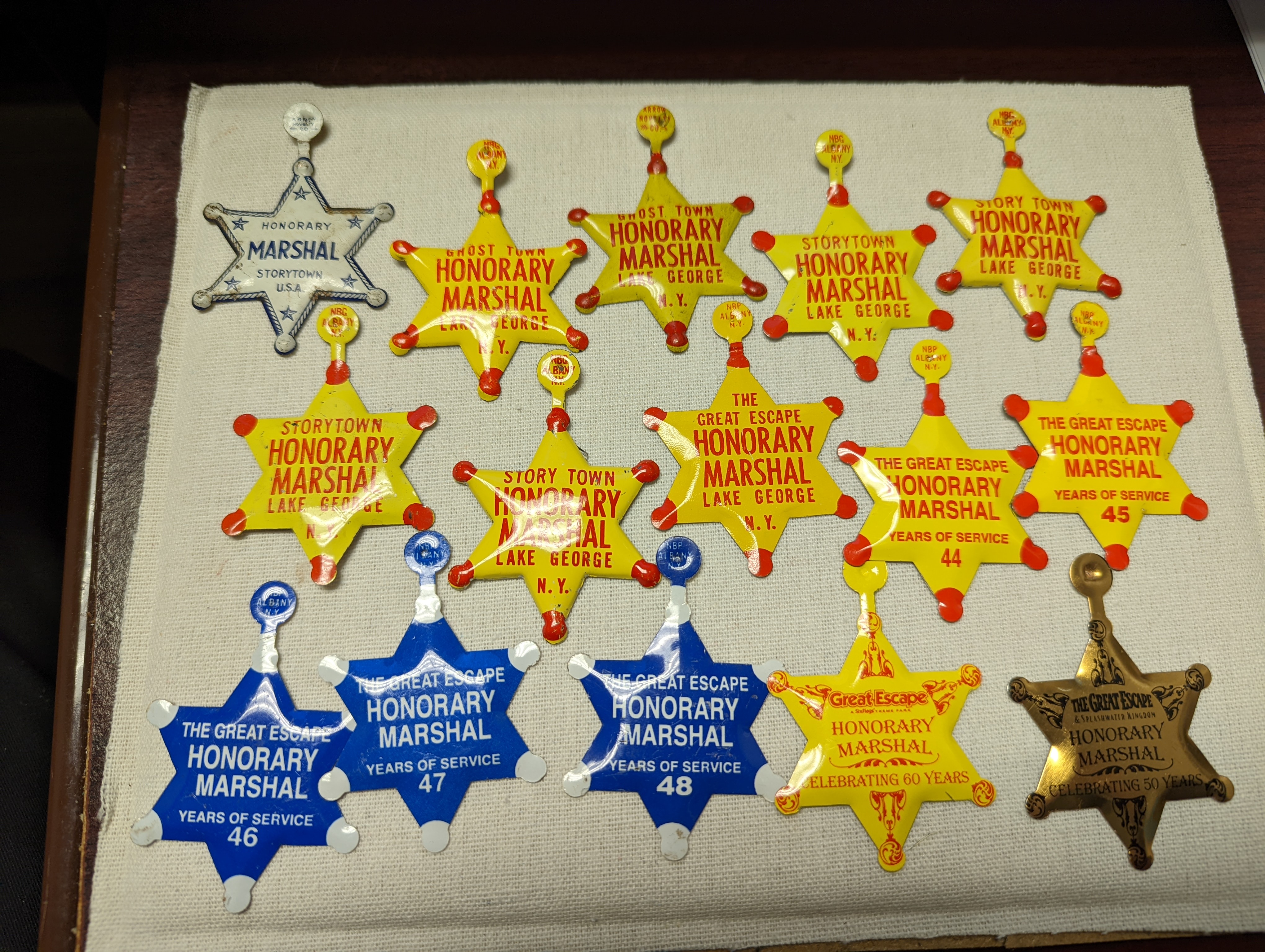 The pin at center middle now says “The Great Escape,” and the company manufacturing the pin is listed as NBP of Albany, N.Y. Judging from the name change, this may have been awarded to junior marshals between 1994 and 2000.