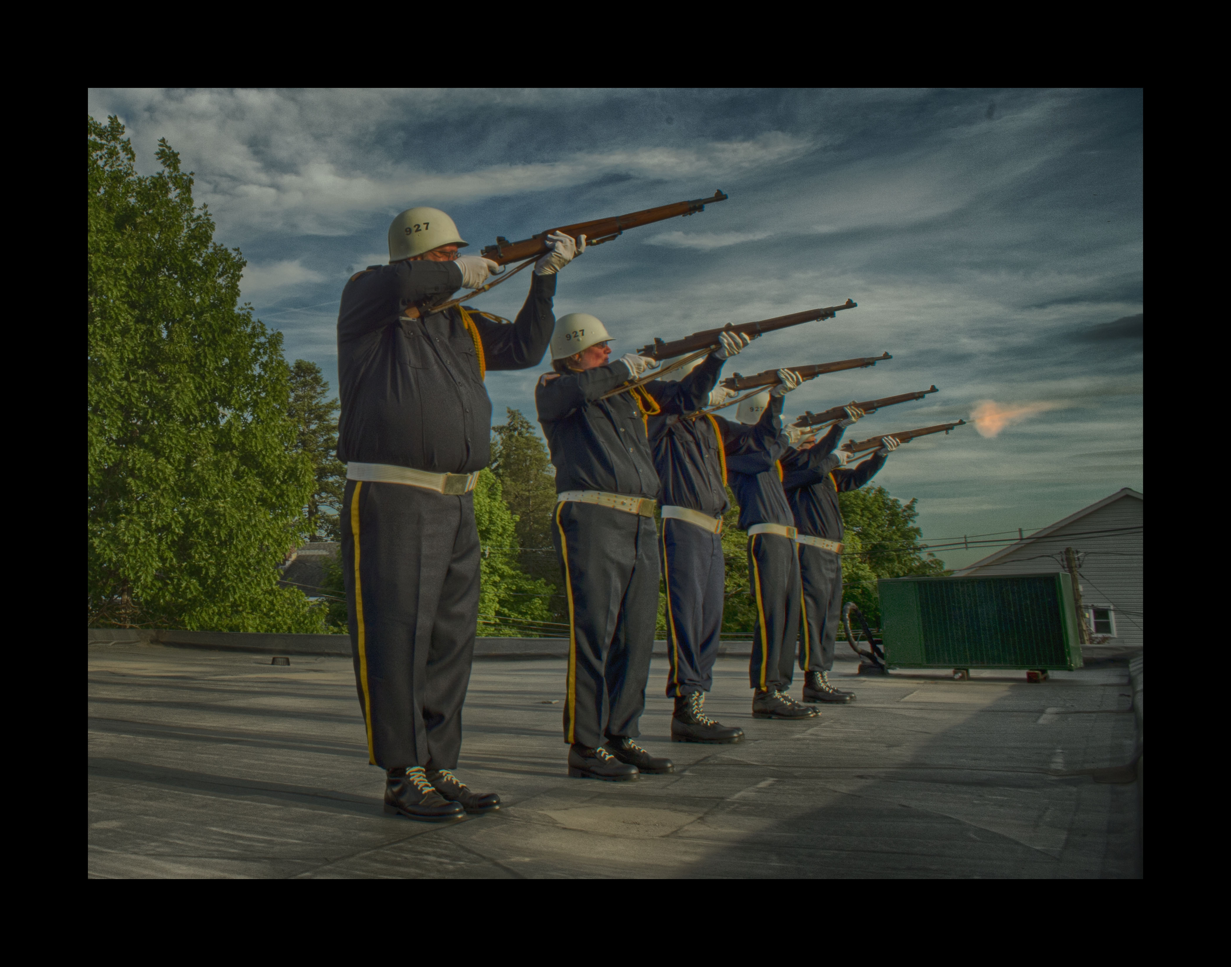 There I was. On the roof with five American Legion sharpshooters. After a quick conversation, I discovered they would offer a three-gun salute upon the dedication of the monument. So long as I was not in their direct line of sight, or being distracting or dangerous in any way, they would let me take their photo.