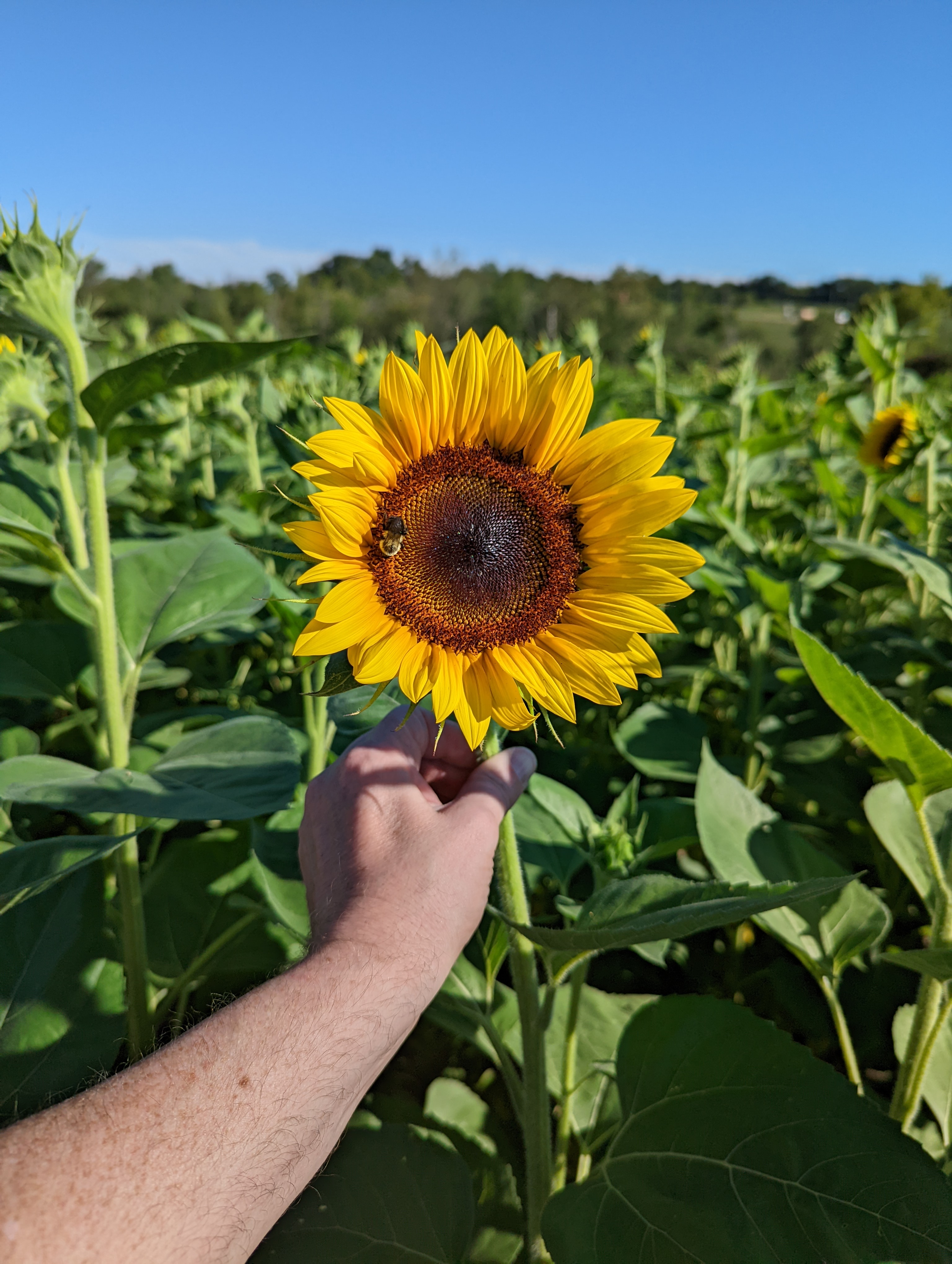 Even if it meant turning one sunflower towards me to capture it and a pollen-drunk bee on the flowerhead.