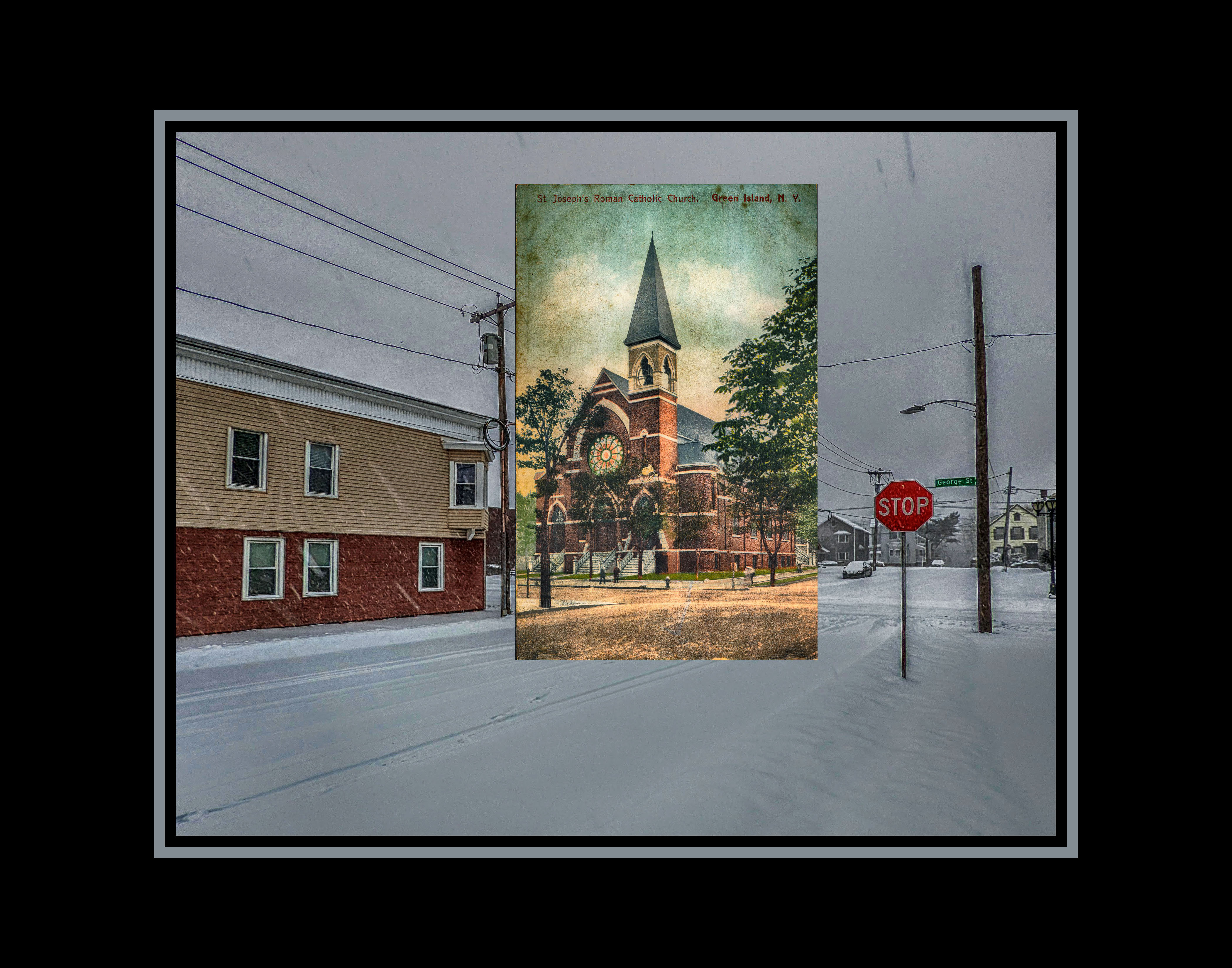 This is what happens when you go outside, it’s snowing like crazy, and you’re trying to superimpose the location of a 125-year-old postcard upon the structure of a corner church. Well, I did it.