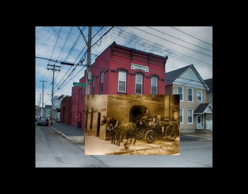 This one picked up an honorable mention at the New York State Fair, and features a vintage “real postcard” photo of an old horse-drawn fire pumper against the foreground of the still-standing McGowan Firehouse in Green Island. That building is now an apartment complex.