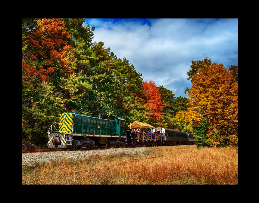 Now that works. I’ve got reds and yellows on the trees, gold and tan weeds in the foreground, and that olive green ALCO-5 diesel locomotive pulling the tourists through the Adirondacks.