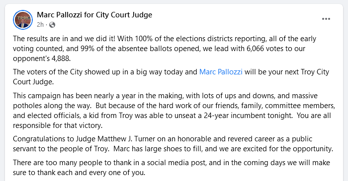 My friend Marc Pallozzi, a former trivia teammate of mine from way back in the day, won his bid to take the gavel as a Troy City Court judge.