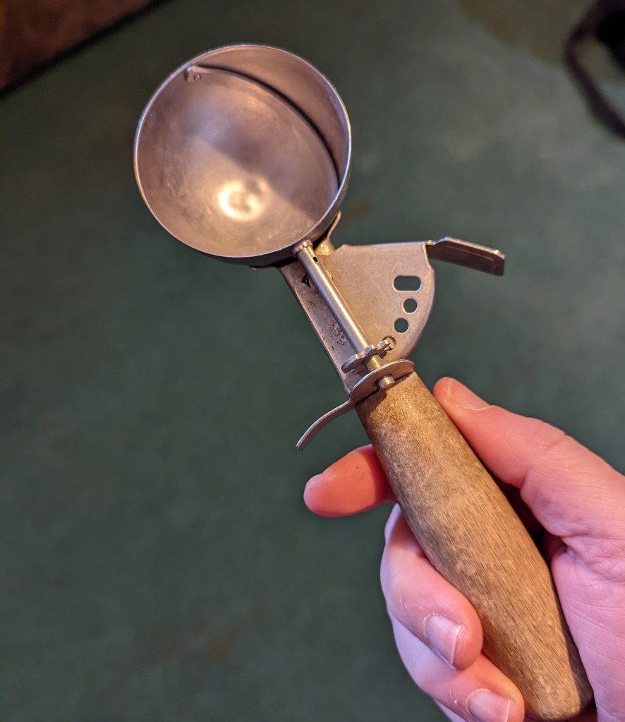 Eventually, after a little searching here and there, I found an old ice cream scoop. It’s the kind where you push a lever and a little rail frees the ice cream from the scoop. It had a $2 sticker; the estate sale banker gave it to me for $1 (with eight cents sales tax).