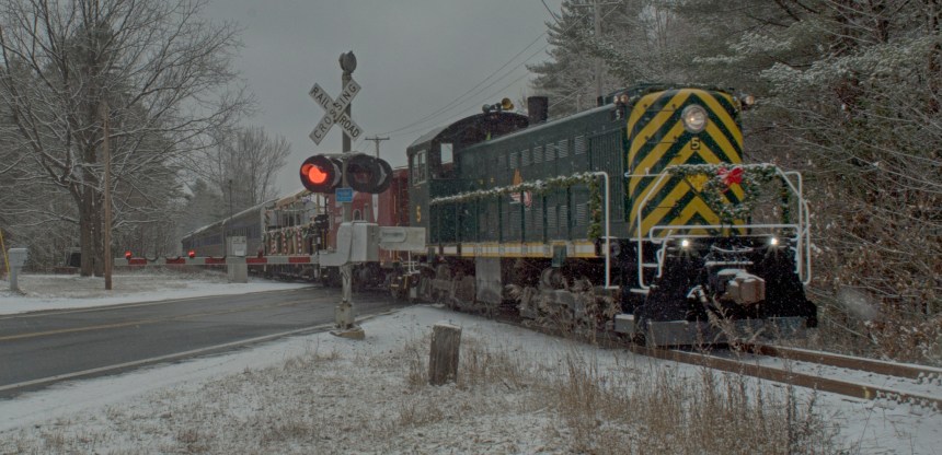 During my Sunday photo shoot of the Saratoga, Corinth & Hudson Railway train, I set up my gear so that the train would pass across Route 9N. Now when a train bisects a road, the railroad crossing sign flashes and a little gate drops. And lights flash on and off as the train passes.