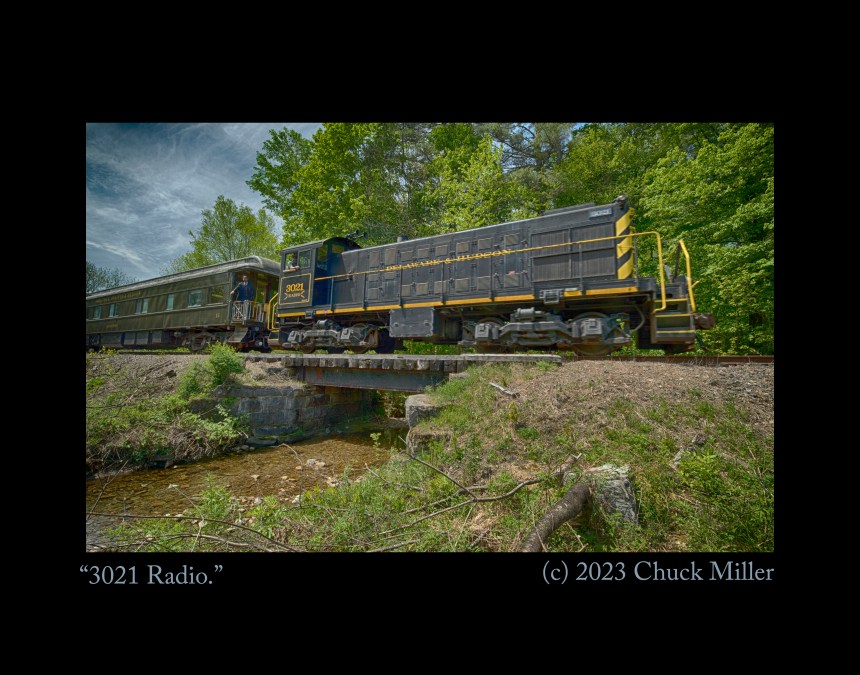 Hello, short pile. Iowa … Syracuse … Durham … Altamont … one of those four will get this image in competition. Conductor in the window? Check. Ticket-taker in the front car? Check. Funyuns wrapper in the stream? Chuck checked, no wrapper. Check.