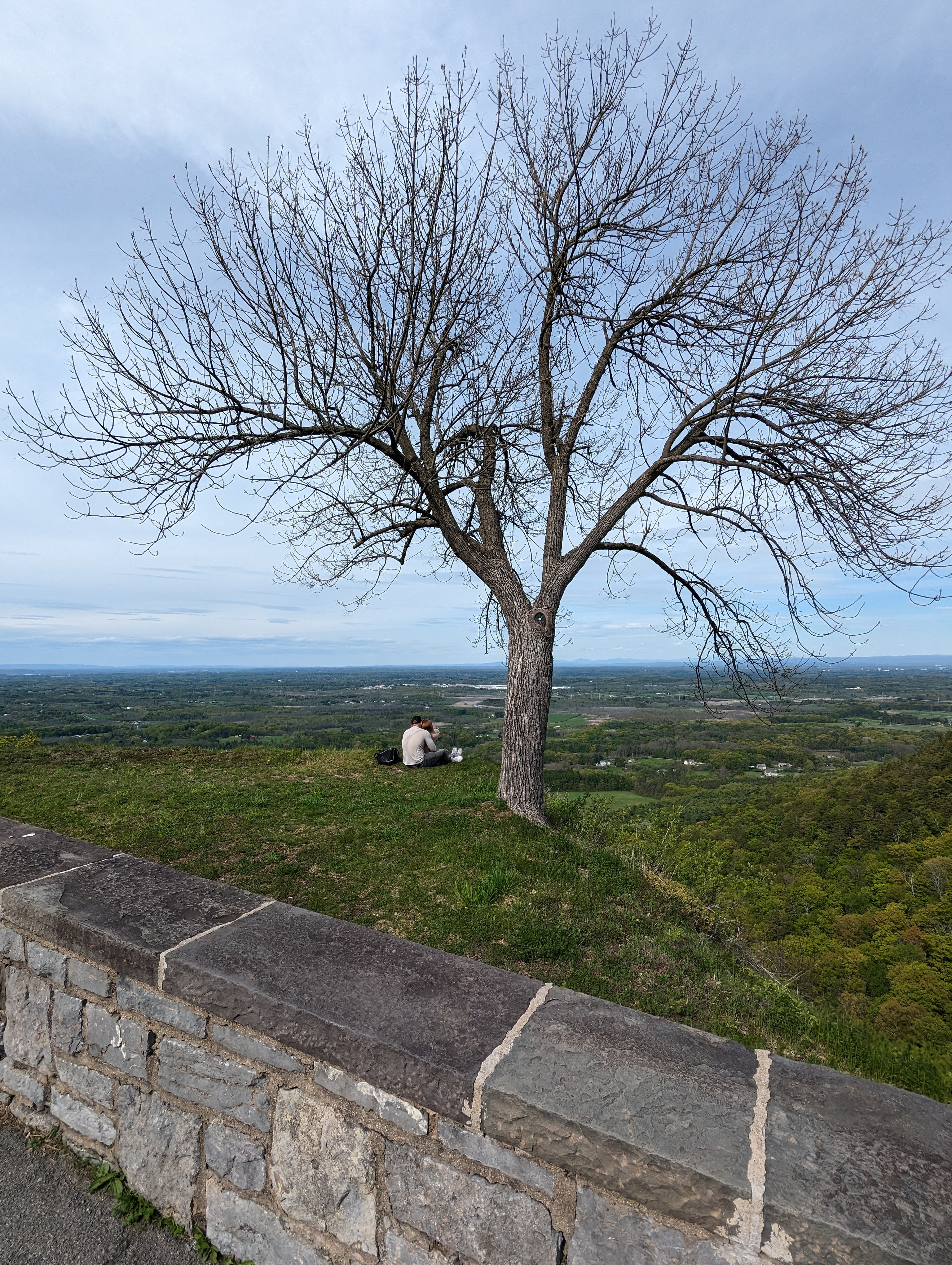 There’s also a solitary tree that grows between the edge of the outlook and a stone fence. The stone fence is there to keep people from going too close to the cliff’s edge. Believe me. The park does several rescues a year of people who climb the fence and think that it’s cool to pose with the tree as some kewl selfie, not realizing that the ground is slick and you could slide off the cliff at any time.