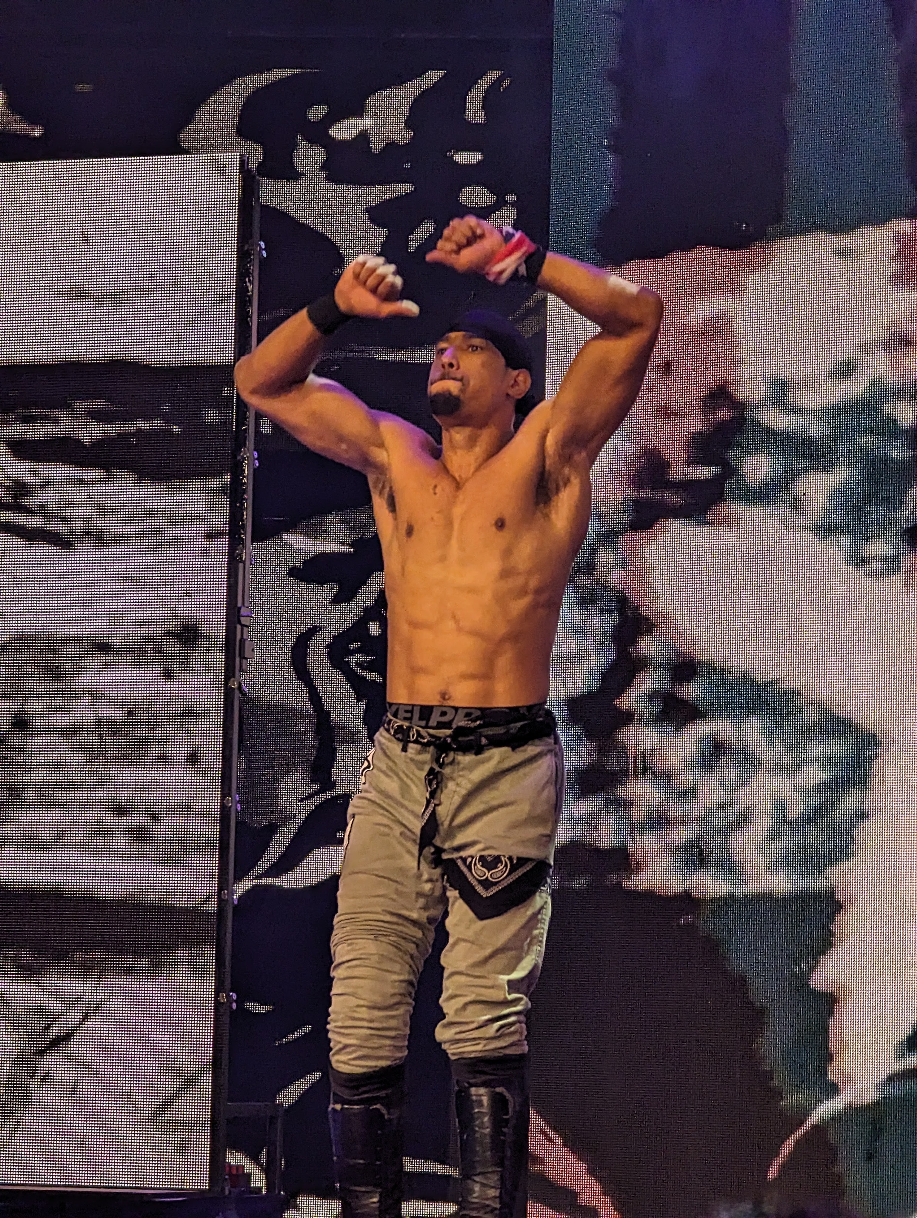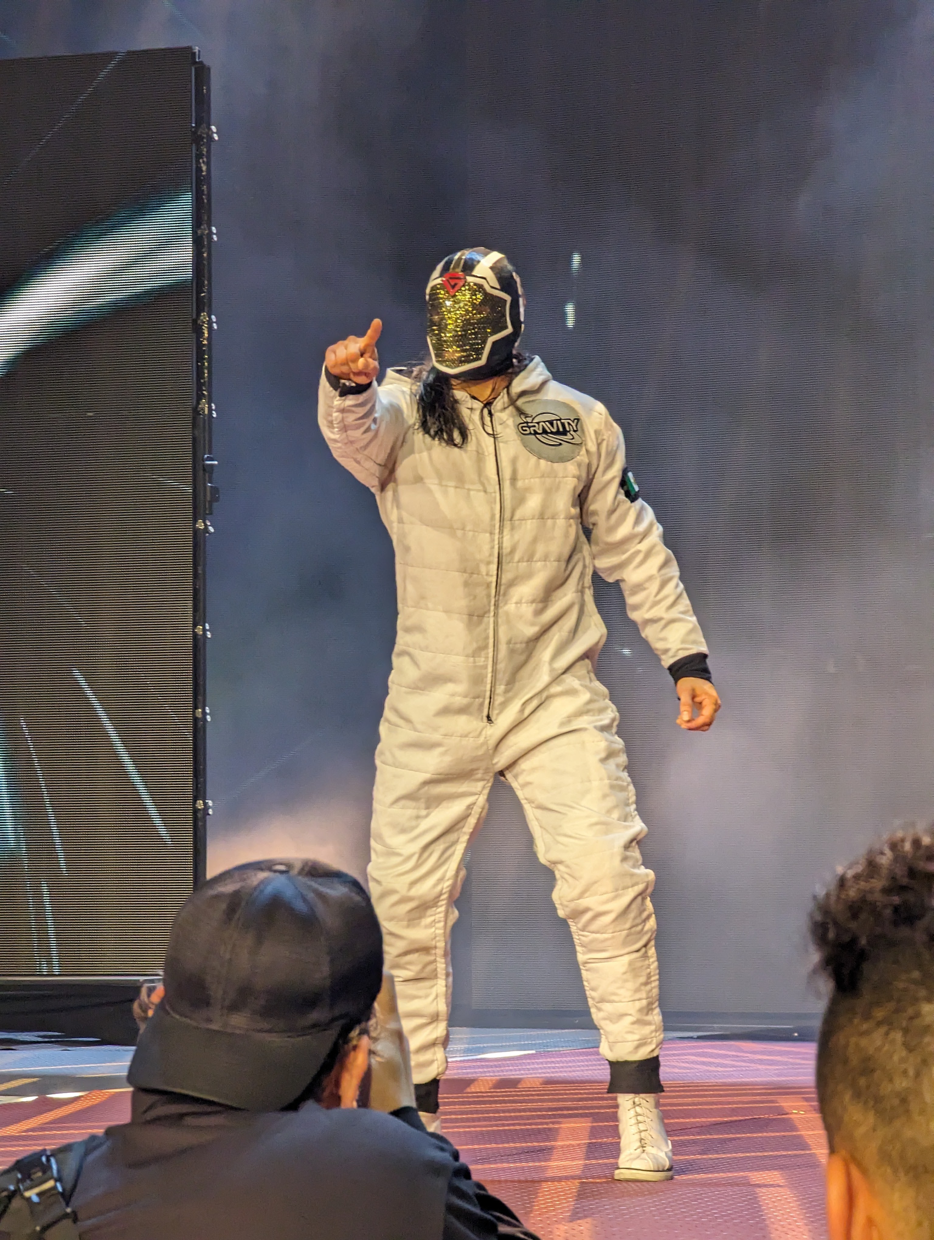 Now I should mention that there were some very excited AEW fans one row behind me. And one of those fans brought the national flag of Mexico with her, and any time a luchador entered the ring or returned to the dressing room, she made sure to wave that flag in support of the masked stars of lucha libre. And this actually got her some attention – one of the newly-signed AEW stars, this guy – Gravity – actually stopped on the way back up the ramp and pointed at the flag and offered his support for his home country.