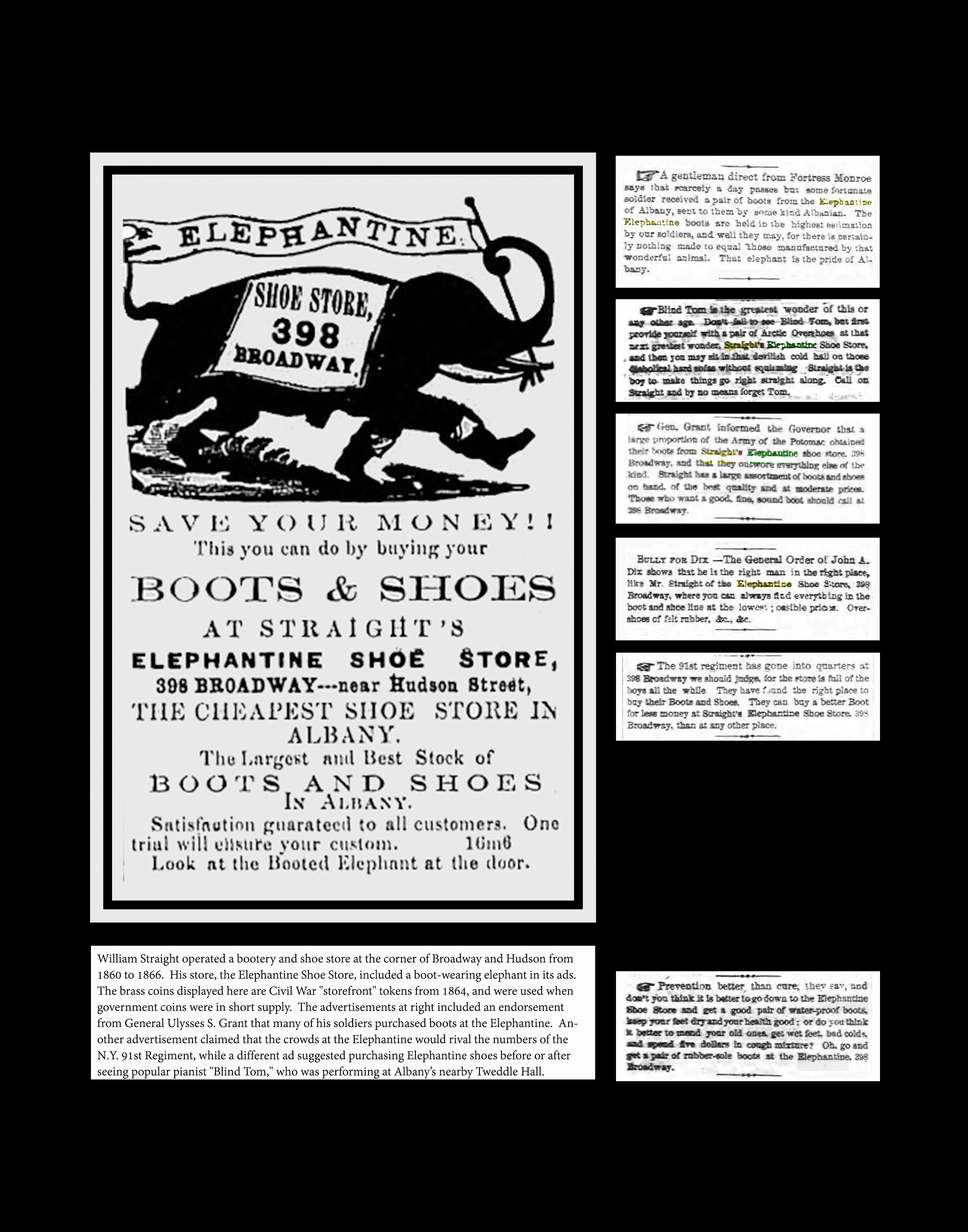 I’ve written about William Straight’s shoe store in Albany before. He operated a bootery and shoe store from approximately 1862 to 1866 at the corner of Broadway and Hudson Avenue in downtown Albany (a parking lot exists there now). While his shoes and boots were probably just as good as any other boots and shoes on the market at that time, Mr. Straight had the foresight to create an advertising logo – an elephant with boots on its feet.