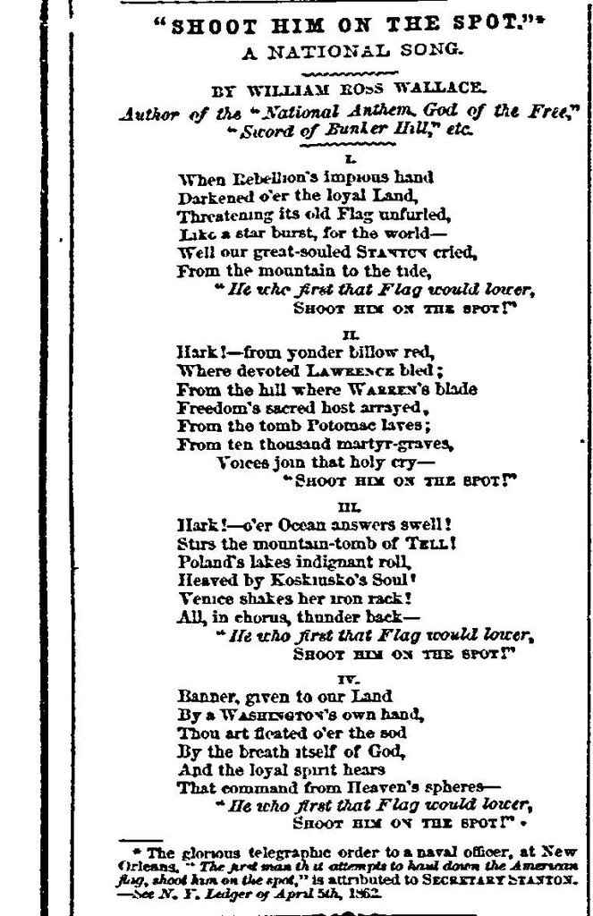 The epithet “shoot him on the spot” became one of the most ubiquitous phrases of the Civil War. Dix’s fury became a popular poem and song, as reproduced here. The poem’s author, William Ross Wallace, originally credited the statement to another politican, but would later correct the reference in future printings.