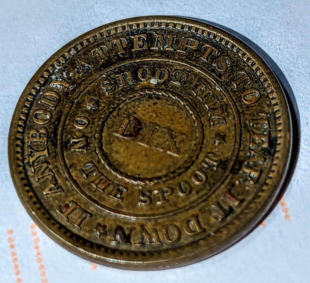 The “Shoot Him on the Spot” quotation also made its way to a series of Civil War coins, with the obverse featuring the Stars and Stripes with a Liberty cap atop its pole. The coin’s reverse has Dix’s “Shoot Him on the Spot” phrase, clear as day.