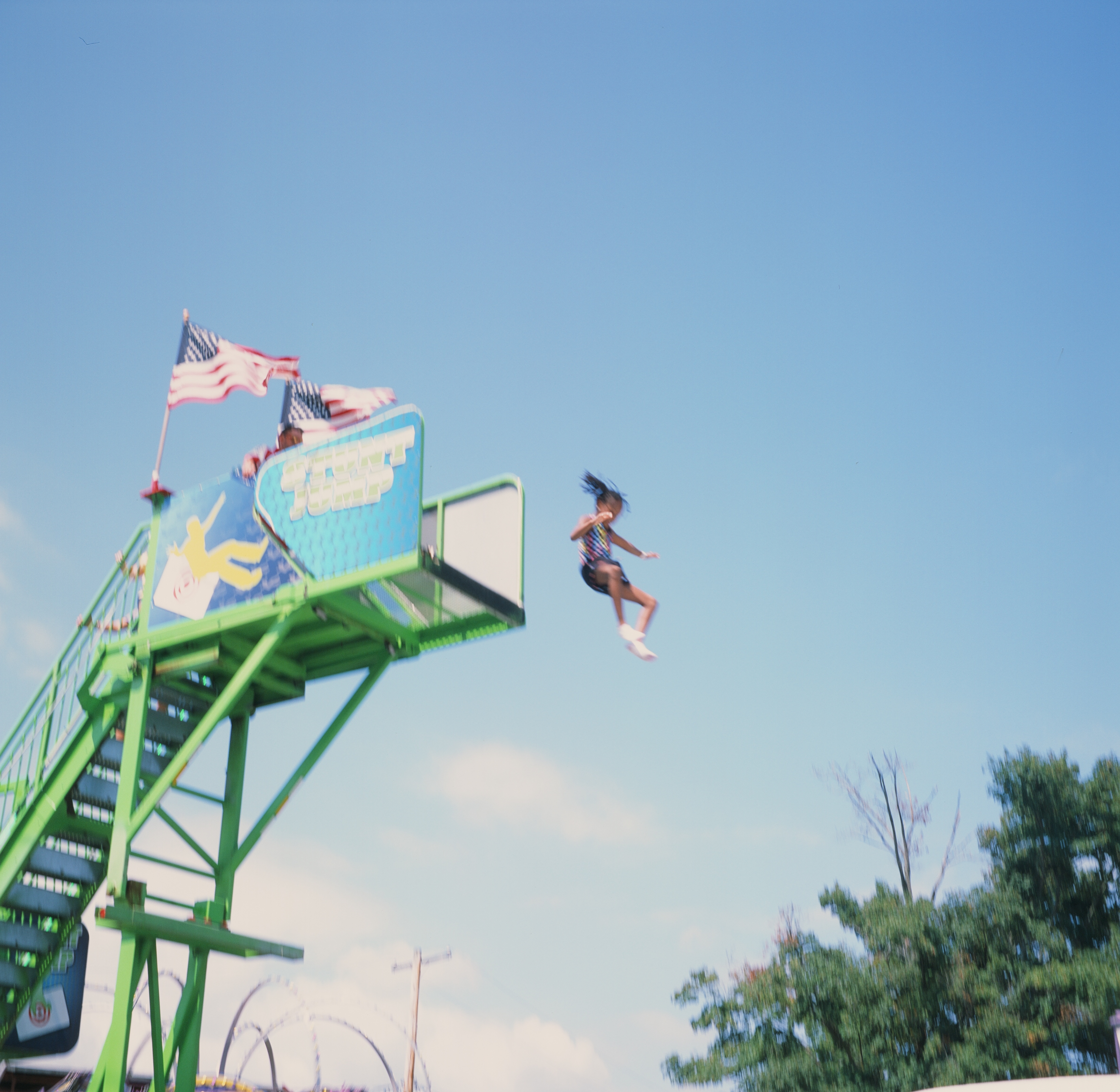 Now before you imagine that someone’s going to do a Triple Lindy off the diving platform – no. The ride organizers have specific rules for the ride. No flips, no stunts, you basically step off the platform and land on your back. And you don’t jump until you’re sure that no one else is on the crash pad, lest you land on the pad and immediately launch someone else back into the air. Ha.