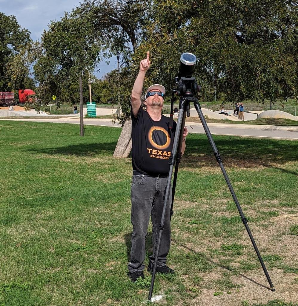 My older Nikon Df – the camera I’ve loved and used for over a decade – will take photos in sequence, one minute apart, as the sun crosses the sky. I put a Vivitar 19mm f/3.8 lens on the chassis – the Vivitar is my widest-angle lens in my arsenal. I’ve also screwed on a 62mm solar filter so as to not incinerate my camera’s internal sensor. If I planned this properly, I should have the “ring of fire” directly over the Atascosa River, which should appear in the water’s reflection. Yeah, I’m playing the angles here. If I pull this off, my next trick is to go to the nearest billiard hall and try to hit a cue ball so that it bounces off eight rails and stops on the center of a $100 bill.