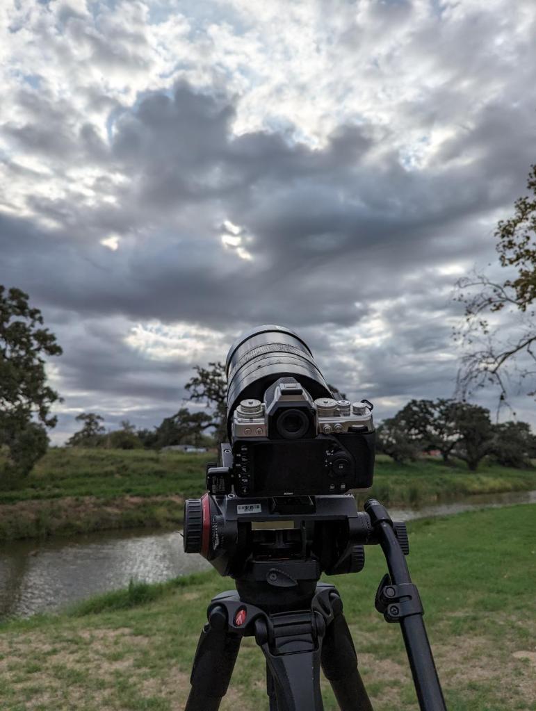 The black Nikon Df stayed in the rental. The cloud cover crept over the Atascosa River, making a time-lapse of the eclipse nearly impossible. Everything needed now has to come from my silver Df with the solar filter lens front. If this cloud cover clears … I can still get some great images.