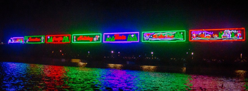 CP Holiday Train over Cohoes-Waterford Bridge 2018 2. Nikon Df camerar, Nikkor 28mm f/2.8 lens. Photo (c) 2018 Chuck Miller, all rights reserved.