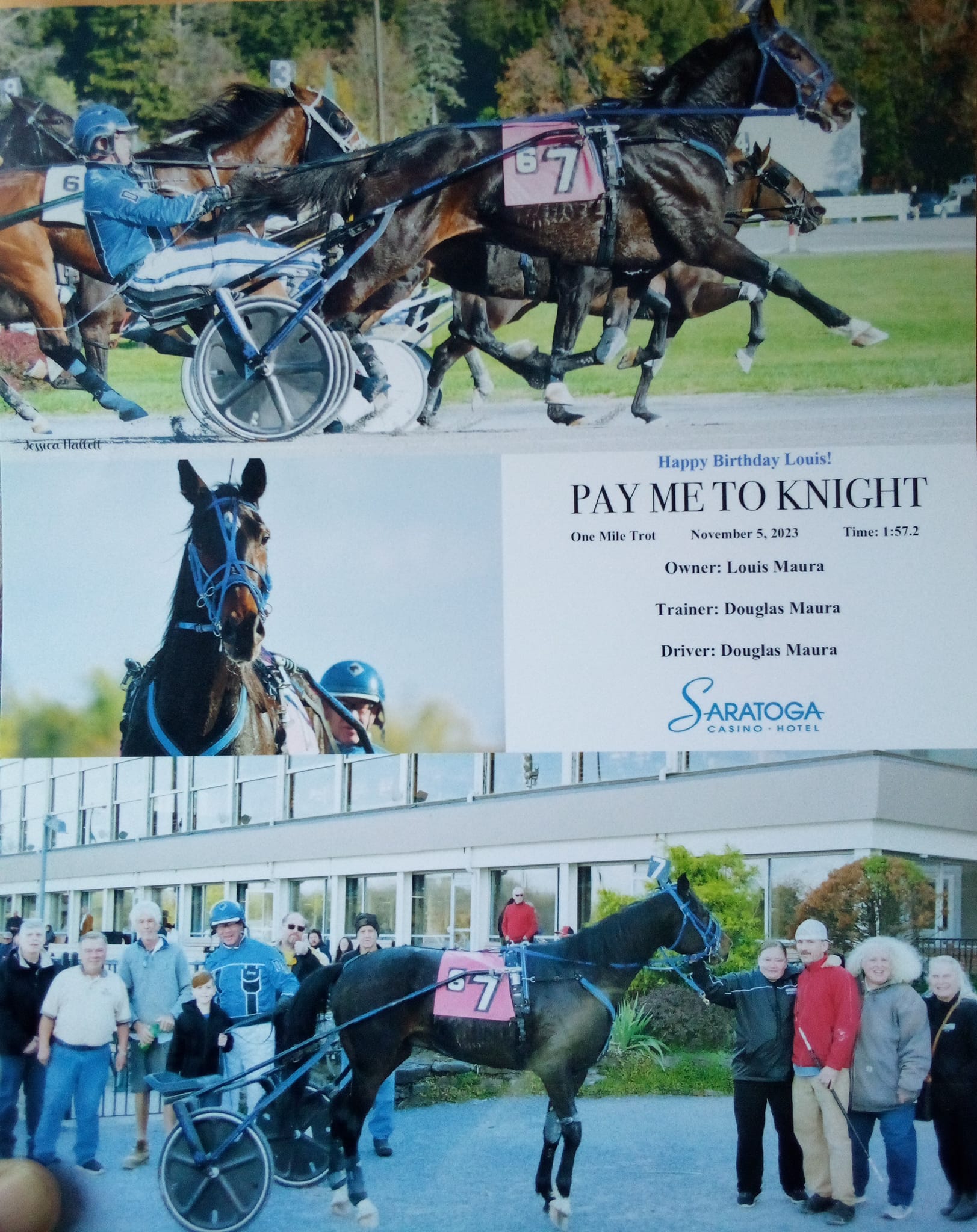 Let’s see. Saratoga Harness has the trotters running … I checked the lineup, and the horse I follow, Pay Me To Knight, will be #7 in the sixth race. He’s a 5-year-old horse with a ton of energy and enthusiasm. I’m friends with the people at the Checkmate Knight Racing Stables, where that horse (affectionately nicknamed “Junior”) calls home.