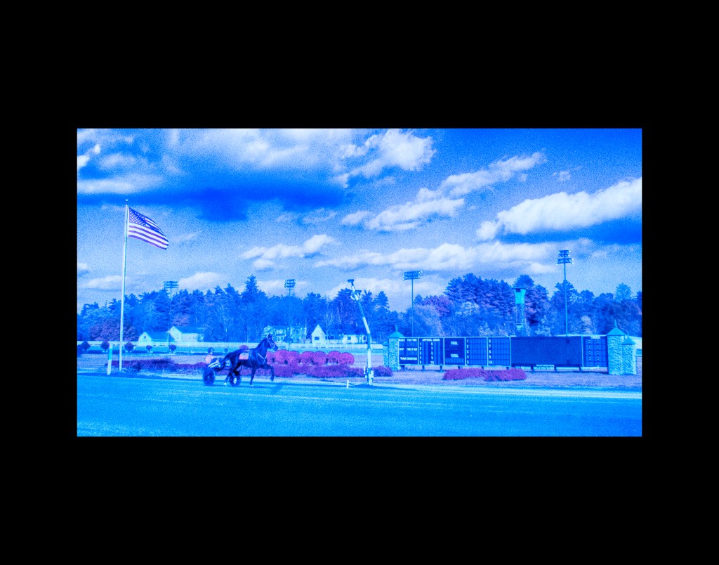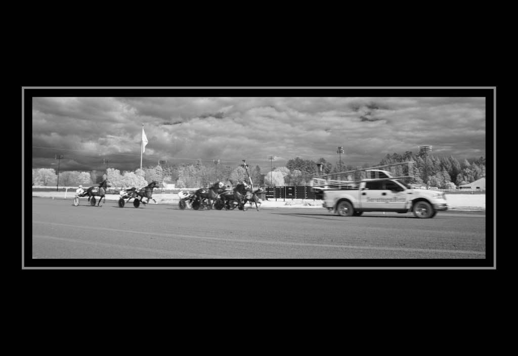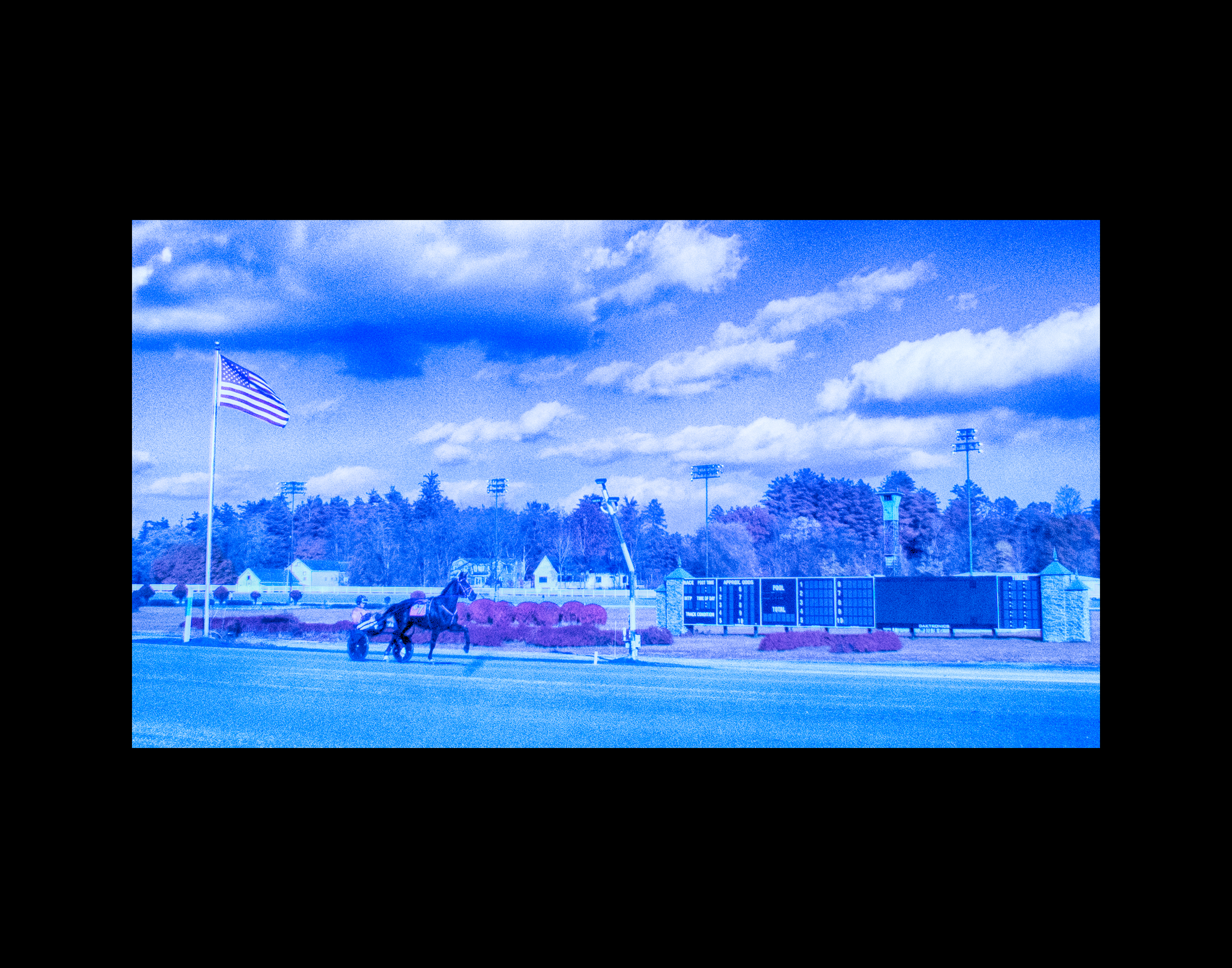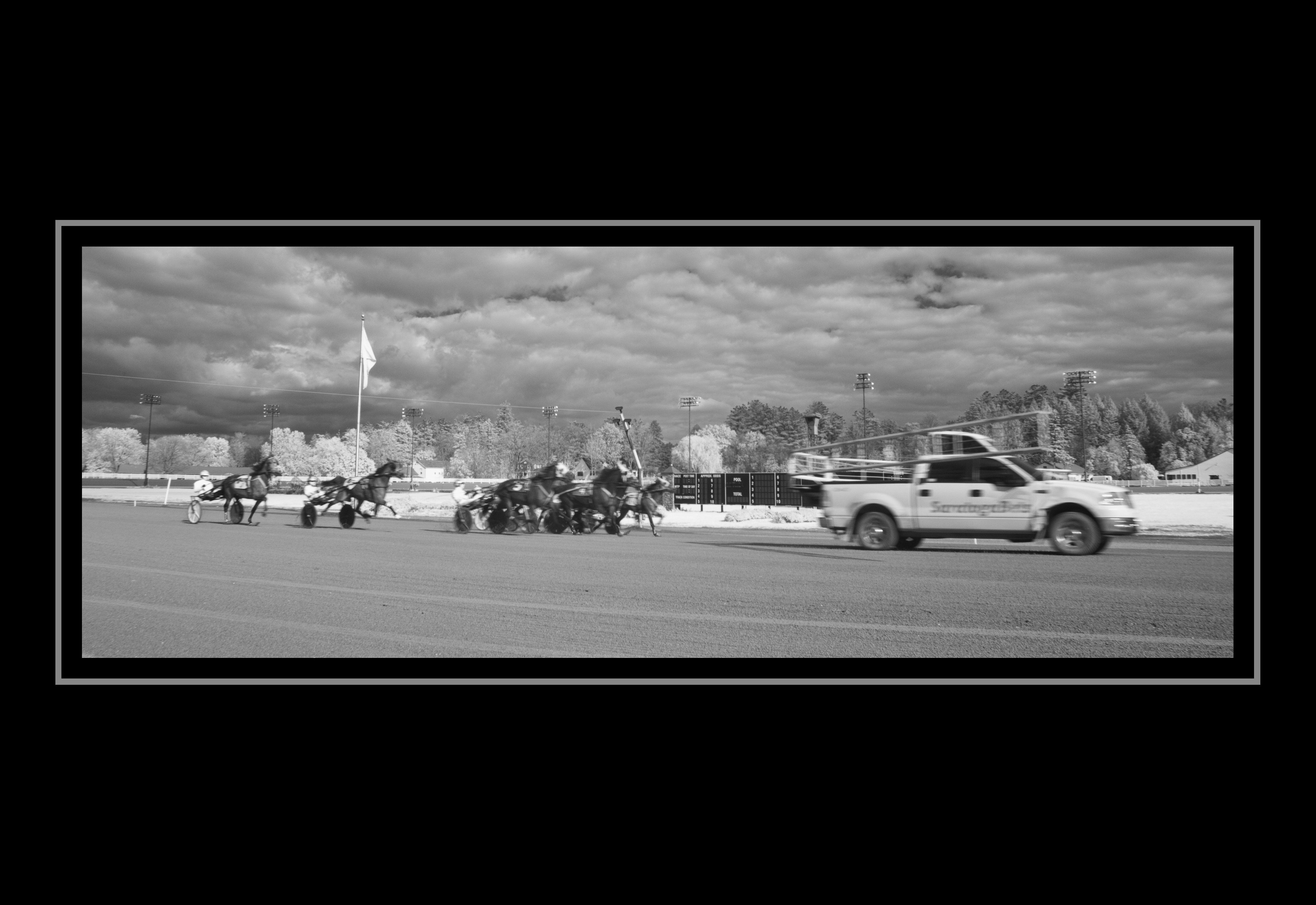 Unlike last Saturday’s infrared photo attempts, which had very little sunshine, I was able to get big bursts of sunshine throughout the first six races at the harness track. First I set up the camera with the 720nm black and white infrared filter. And if this works … I’ll be a happy man.