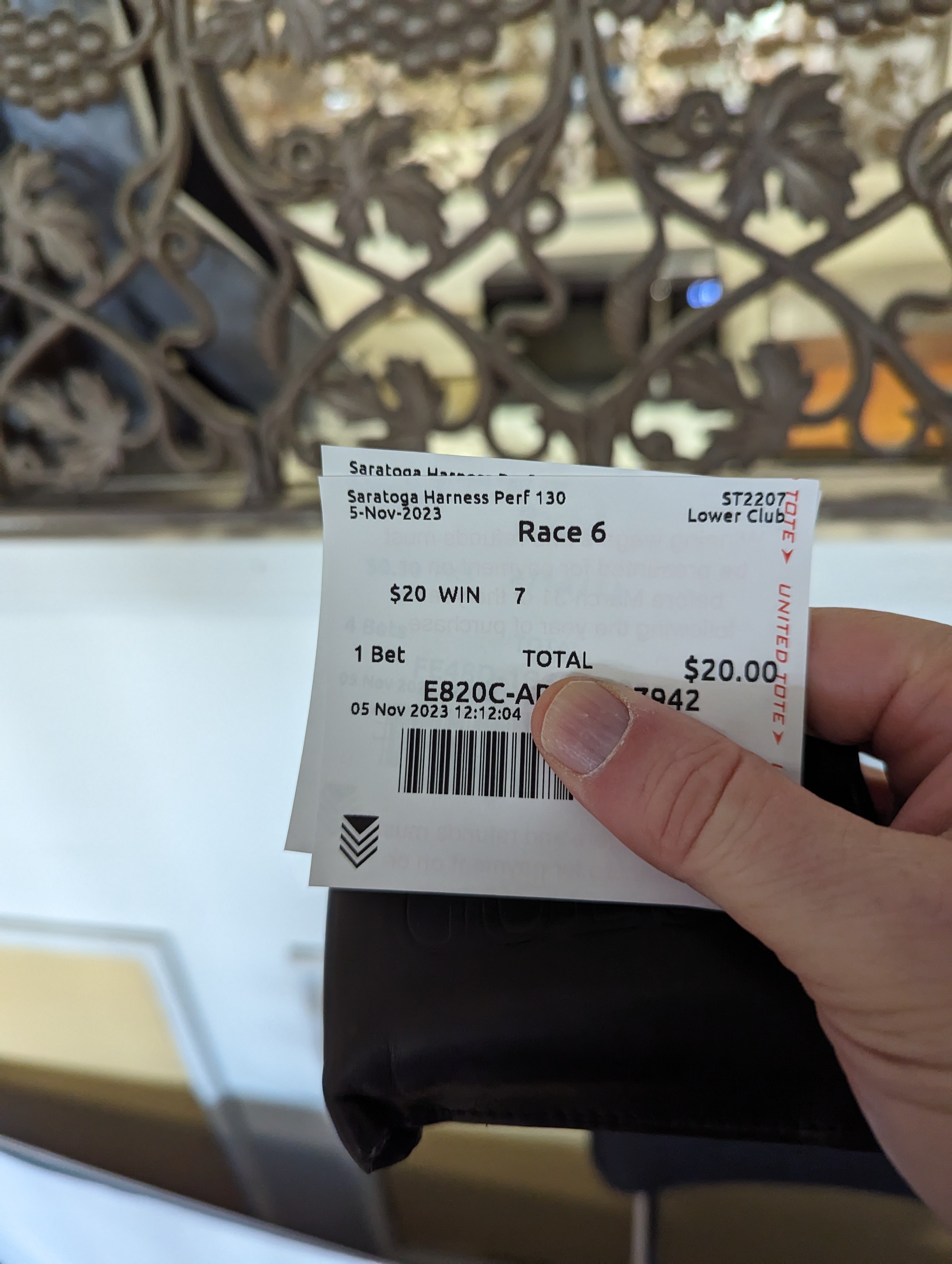 That’s $20 to win on Horse #7 in the sixth race. Also known as Pay Me To Knight. Even if he doesn’t win, I’m still at least $12 in the black.