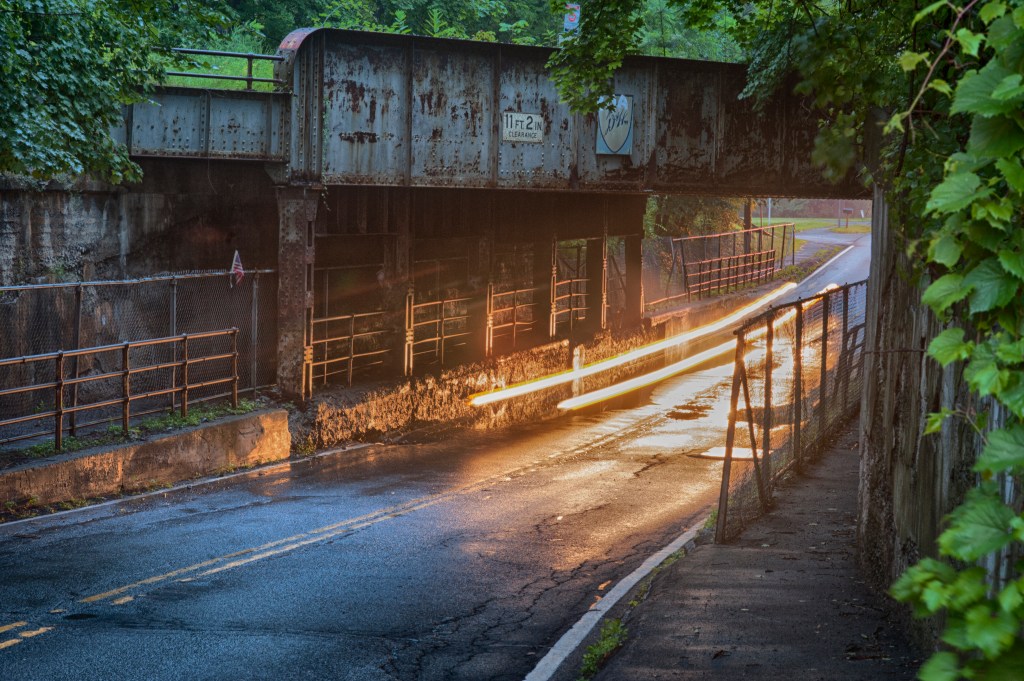 That’s New Scotland Road, with the old Delaware & Hudson railroad bridge spanning it. The streaks of light under the bridge were an early personal experiment in long exposure photography. And the D&H bridge no longer exists; it was torn down and a new span was built – which promptly buckled during construction, so the builders have to try again.