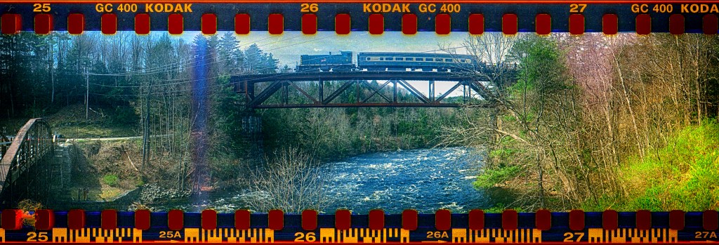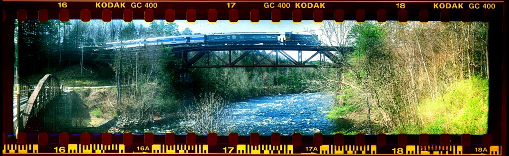 3021 “Radio” crossing Sacandaga. Krasnogorsk FT-2 camera, Kodak 400 print film. Photo (c) 2024 Chuck Miller, all rights reserved.