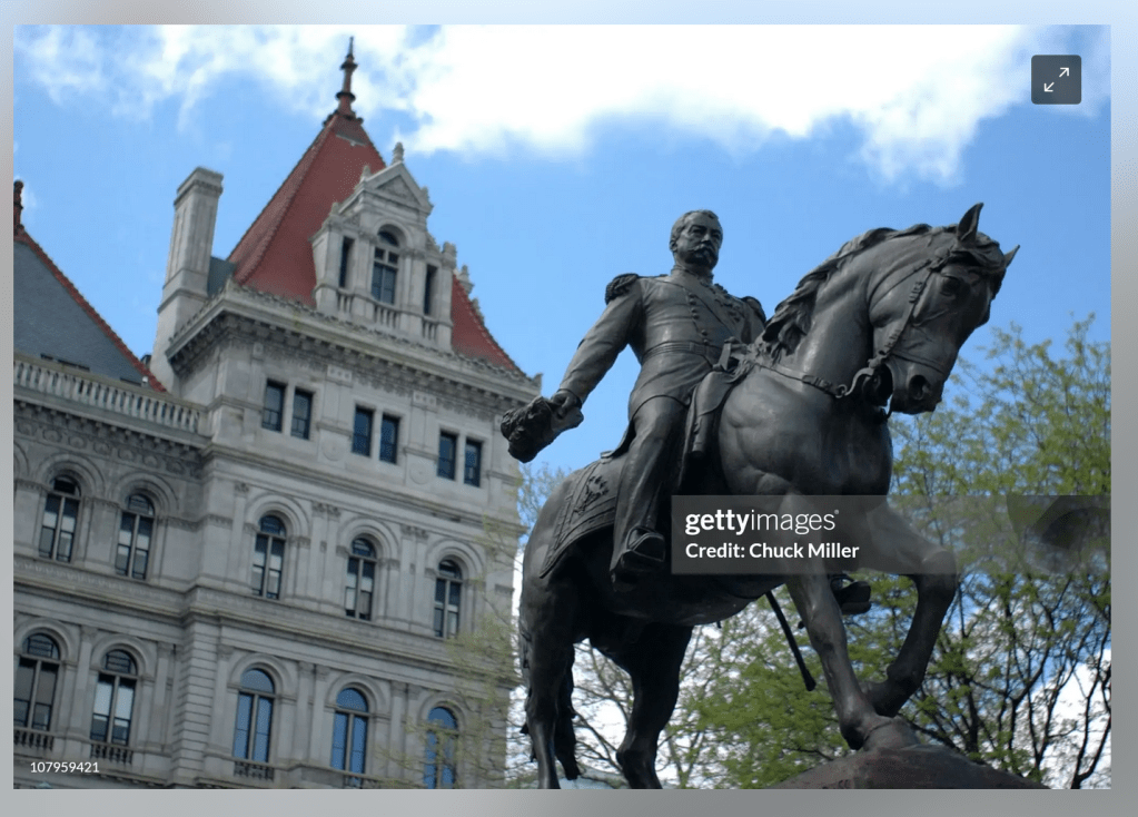 I was in downtown Albany, taking photos wherever I could – just testing out my new-to-me Nikon D700 and having some fun. And as I walked around the Capitol building, I decided to capture a photo of the statue of General Philip Sheridan. Sheridan is riding his horse, and the Capitol building towers are in the distance.
