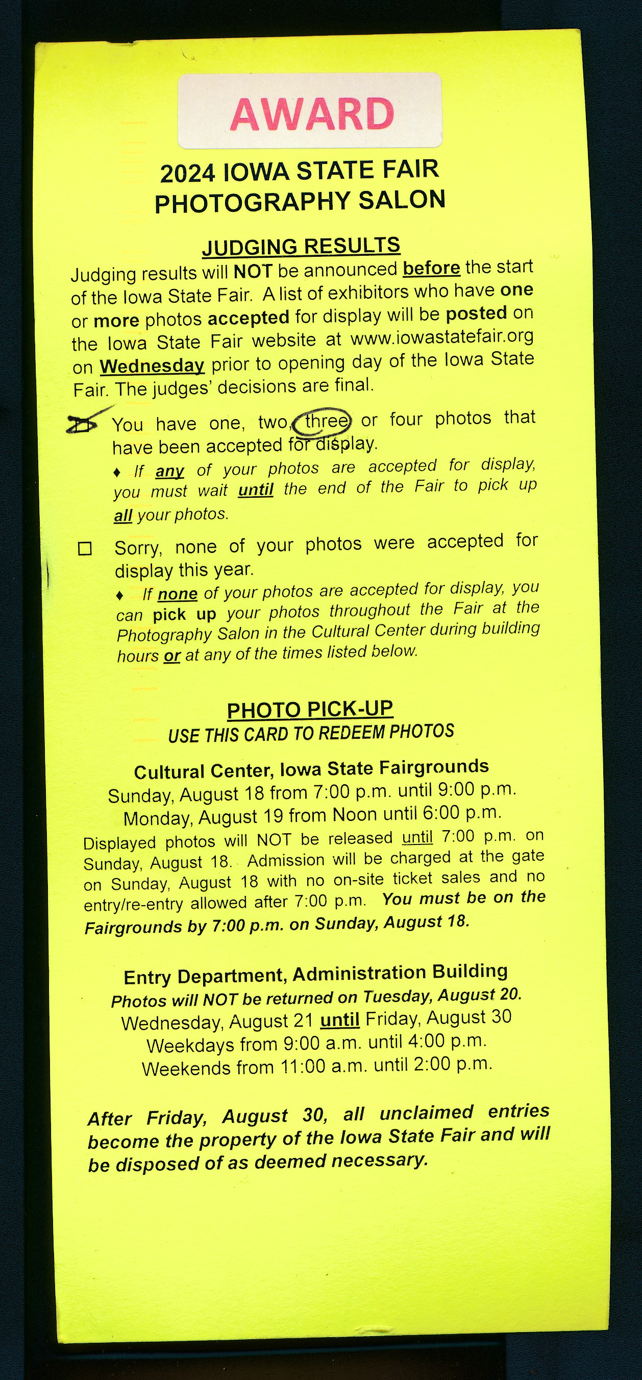 Iowa’s acceptance routine works like this. Entrants receive a postcard saying whether any of their photos made the walls; and if any one of them earned an award. You don’t know which ones made it or which ones didn’t; you don’t know which one claimed an award, or what that award might be.