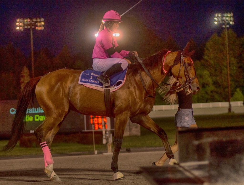 A second mixed race featured jockey Katie Davis against thoroughbred racer Michelle Crawford, both competing in a “Riders Under Saddle” race, where instead of competing from bikes, the riders actually sat on the trotters’ backs and raced them around the track.
