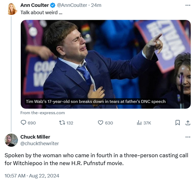 There she is. Ann Coulter. The woman who slithered out from under the bridge to heckle the Billy Goats Gruff. She took that emotional moment and turned it into an attack on Gus Walz.