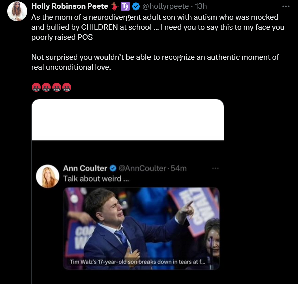 And I wasn’t alone. Holly Robinson Peete, the beloved actress from 21 Jump Street whose own father was an original cast member on Sesame Street, shared her thoughts on Ann Coulter’s demagoguery.