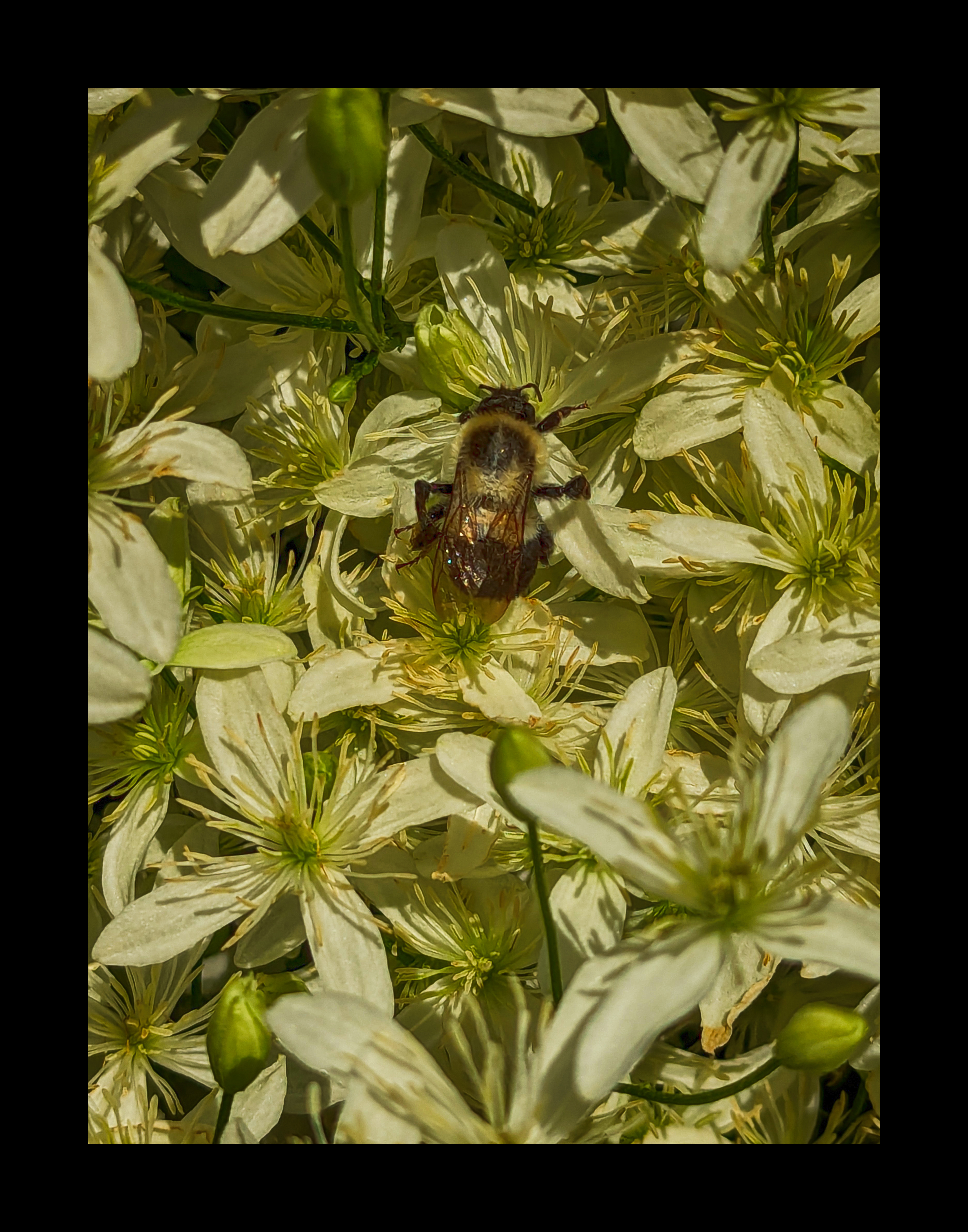 But on the way back to my car, I passed a clematis grove. Beautiful white-yellow blooms. And as I walked closer to the clematis grove, I saw a swarm of Eastern bumblebees doing what bumblebees do. They flew and buzzed and crawled around the petals, pollinating every stem and pistel.