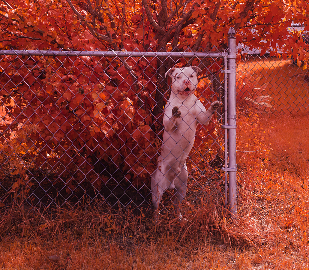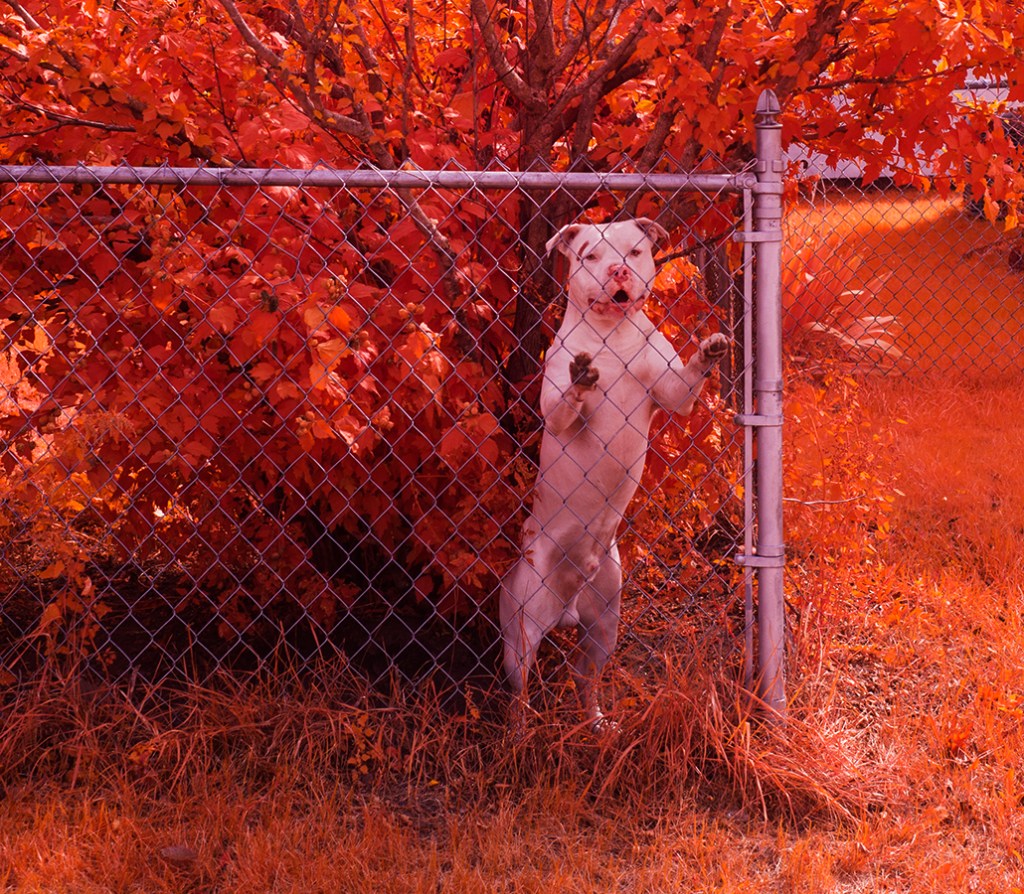 So here’s the thing. Infrared photography works best on foliage. Plants, trees, grass, shrubs, bushes. Apparently it does NOTHING for metal fences. And it does NOTHING for pit bulls. Or for other dogs. But at least this guy sat still long enough to let me capture him in infrared.