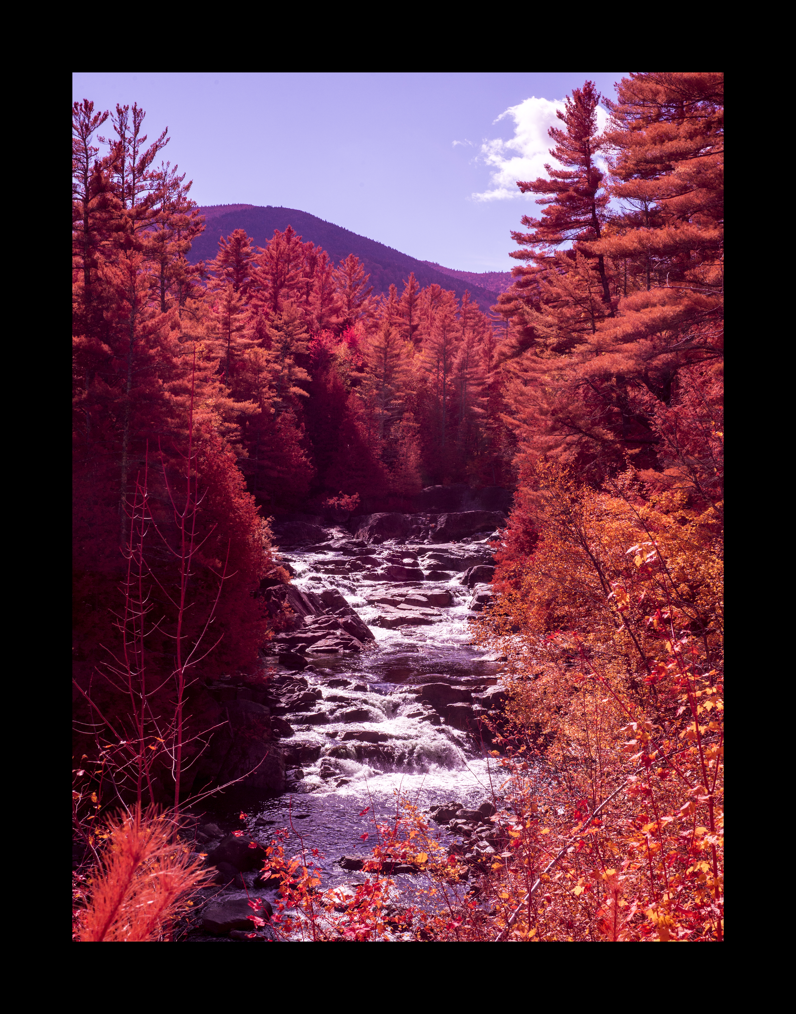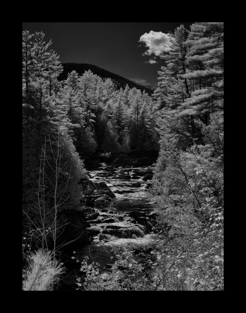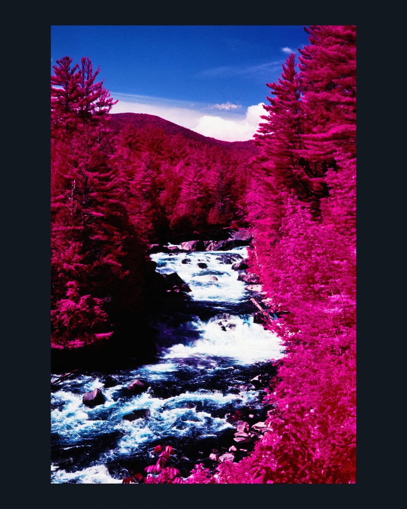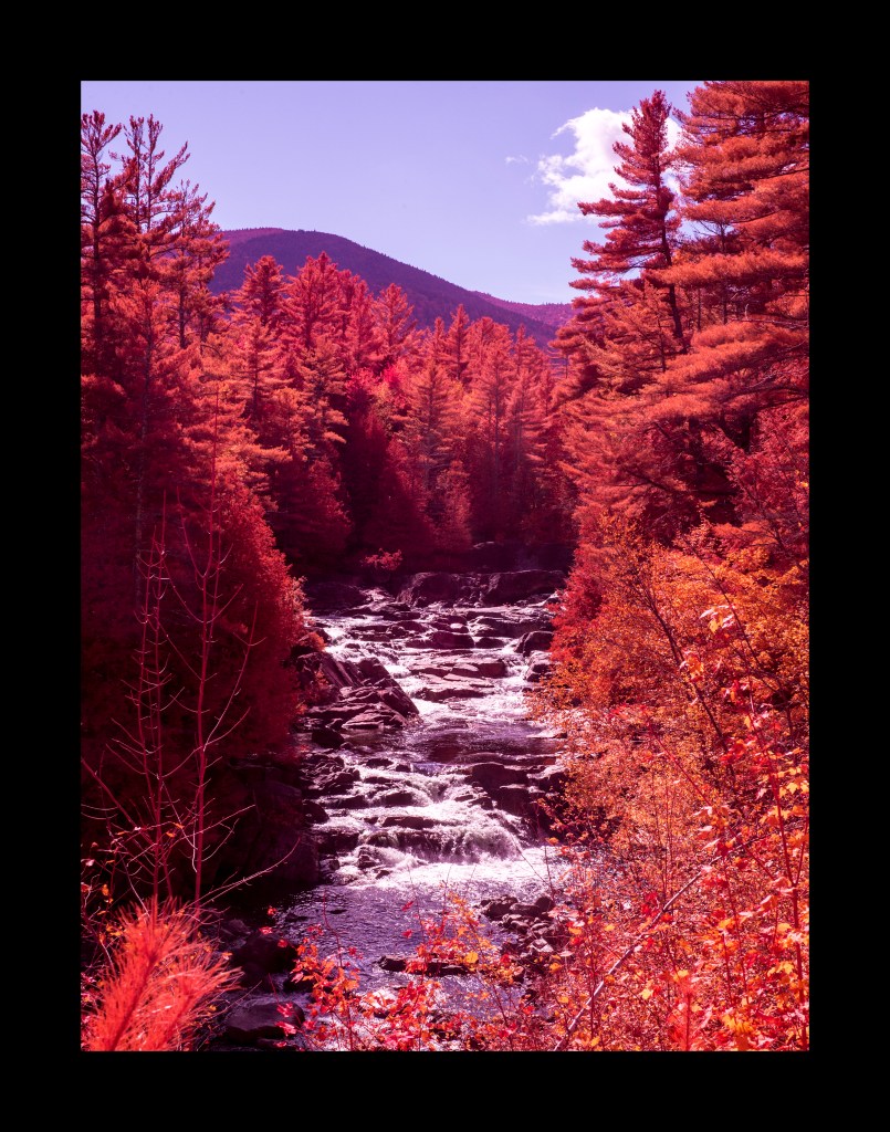 Many years ago, I used vintage color infrared slide film (branded “Aerochrome”) for some photos in the Adirondacks. One of the best shots I pulled from that excursion was a shot of a waterfall near the Blue Ridge Parkway in North Hudson, a photo I christened Aerochrome Falls.