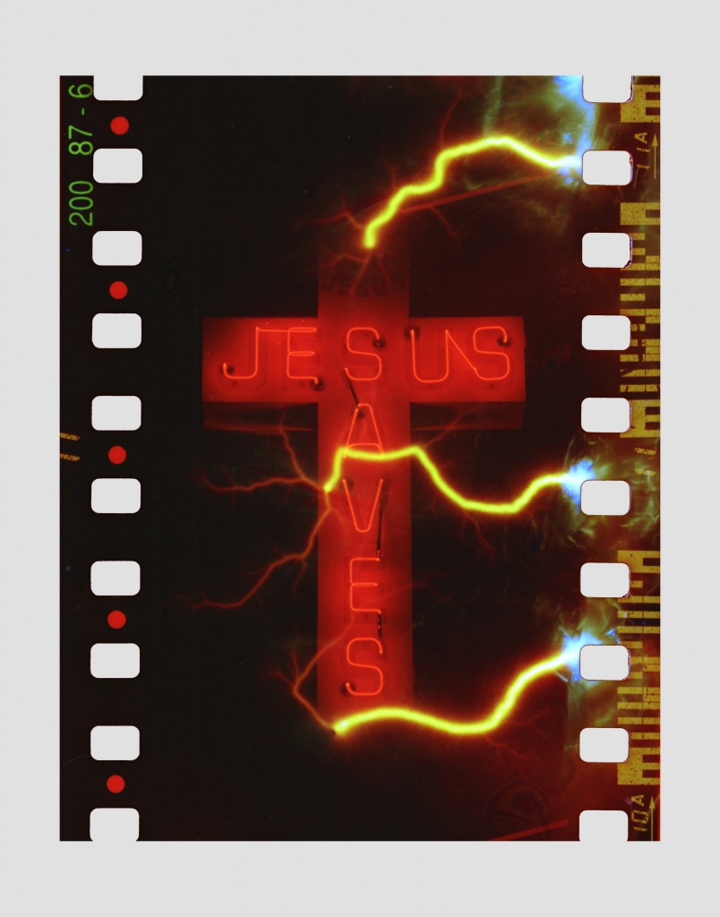 The lightning strikes were already on the film; I captured the image at precisely this spot on the film strip, not knowing precisely where the strikes would interact with the finished image.