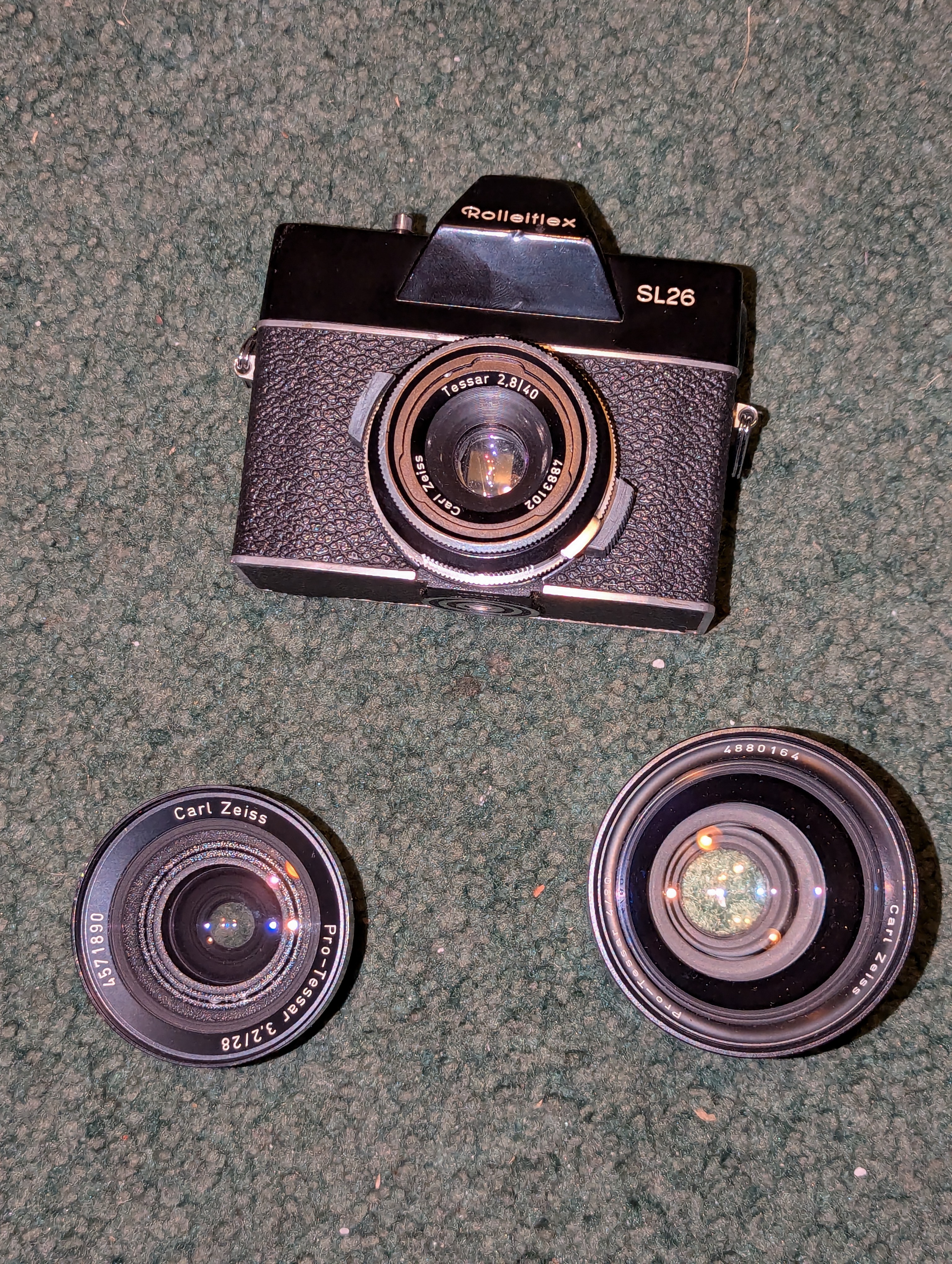 What you see here is the Rollei SL26, a high-end Rolleiflex camera for Kodak’s Instamatic film format. Oh yeah, and it comes with extra lenses. Swank.
