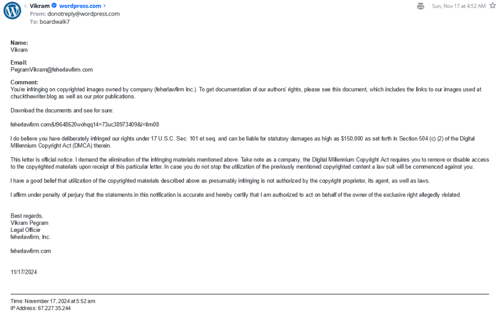 Okay, class, let’s review. There is a link to something called Feher Law Firm, but the link itself looks skeevy. Like it’s not really a link, but a redirect link. Let’s also look at the sentence structure and the syntax. “You’re infringing on copyrighted images owned by company.” Grammar’s not this guy’s strong suit. Hooked on Phonics doesn’t work for him.